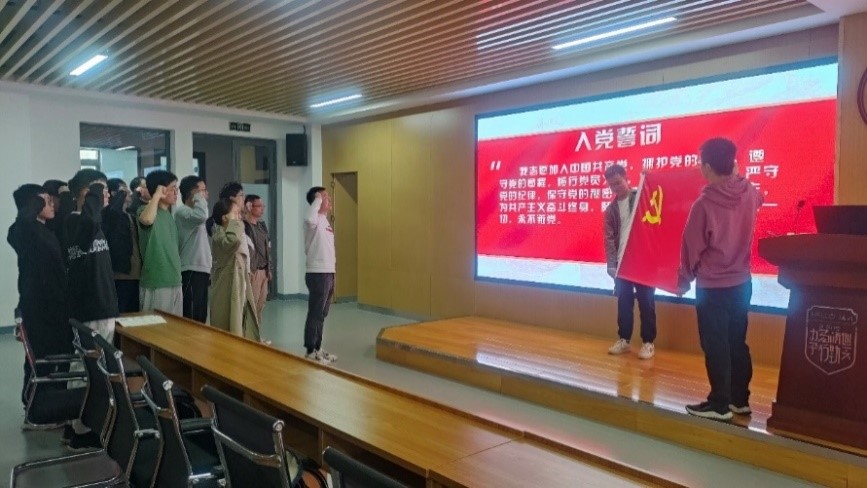 会议第二项,在支部书记付岳的带领下,包括新接收的五位预备党员在内的全体党员面向党旗庄严宣誓。