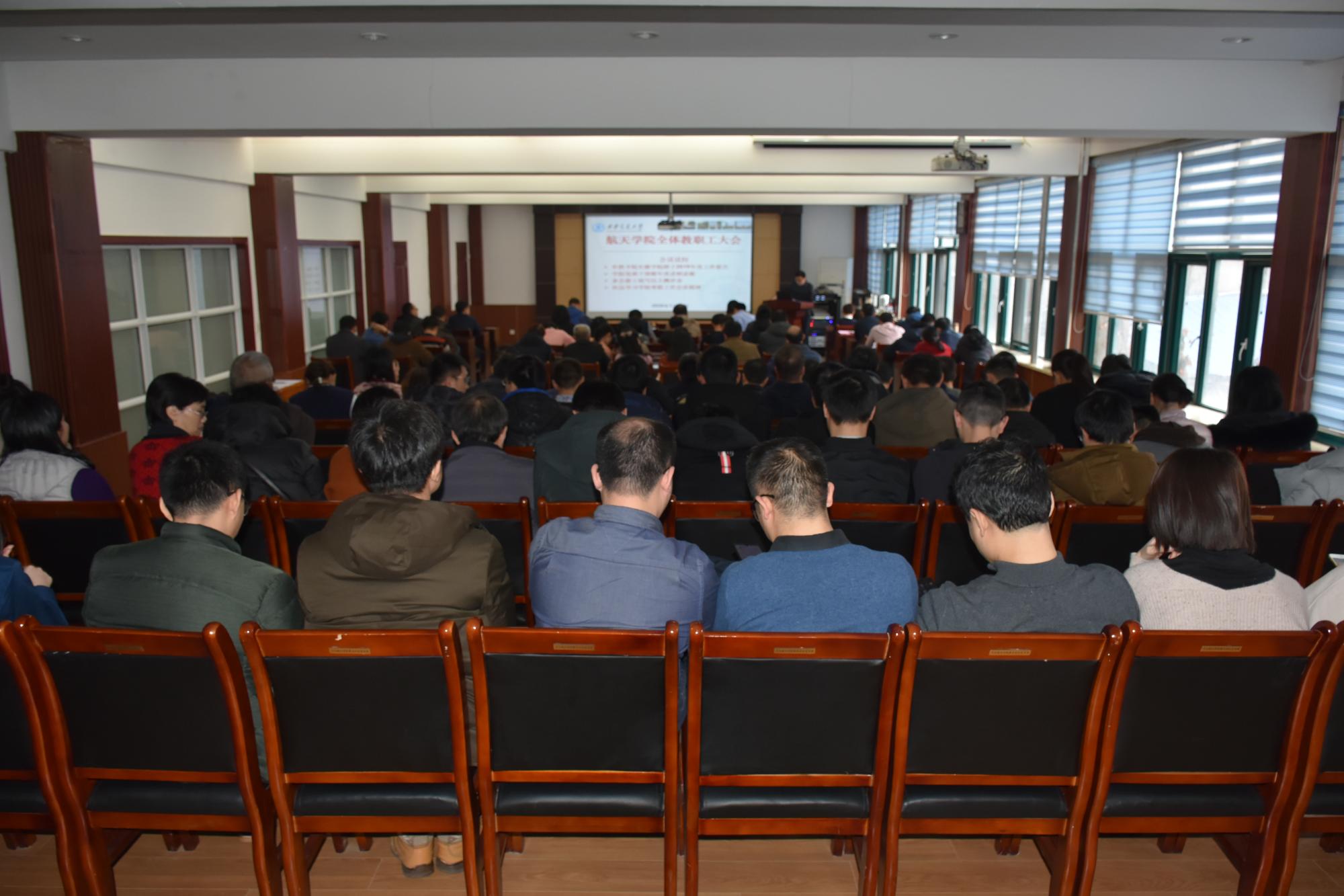 1月11日下午,航天学院召开全体教职工大会,传达学习学校寒假工作会议精神,开展学院党政班子和领导干部年度述职述廉工作。学院全体教工参加了此次大会。