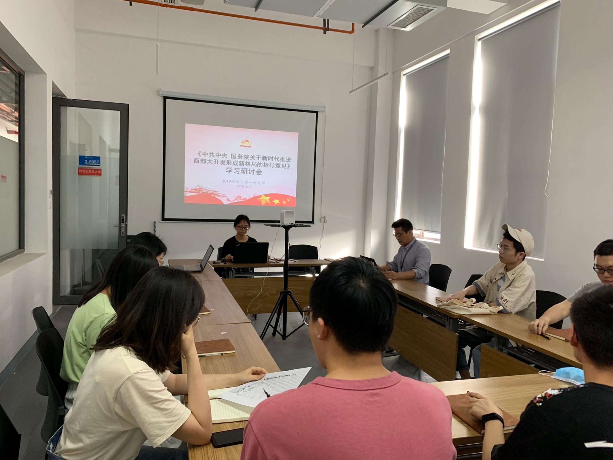 彭方澜简要介绍了本次会议的主要内容,带领大家学习了《意见》的总体要求和具体内容。赵沪围绕《意见》分享了“西部大开发”的战略优势。她提到,占全国国土面积71%的西部地区的发展,关乎到能否早日实现中国社会主义现代化。西部的已有的战略优势,主要为以下三个方面。1.西部生态环境极大改善。经过多年努力,西部地区的生态环境得到了极大改变,风沙肆虐已成历史,荒漠戈壁变成绿洲。2.西部交通体系已具规模。目前西部地区的基础建设已经可以满足企业发展的物流需要。此外,今年的政府工作报告还提出增加国家铁路建设资本金1000亿元,这将让我国交通体系更加完善。3.基建实力满足发展需要。除了以上三点,对外开放大环境下的“一带一路”政策也有利于西部与东部、国外的交流和发展。