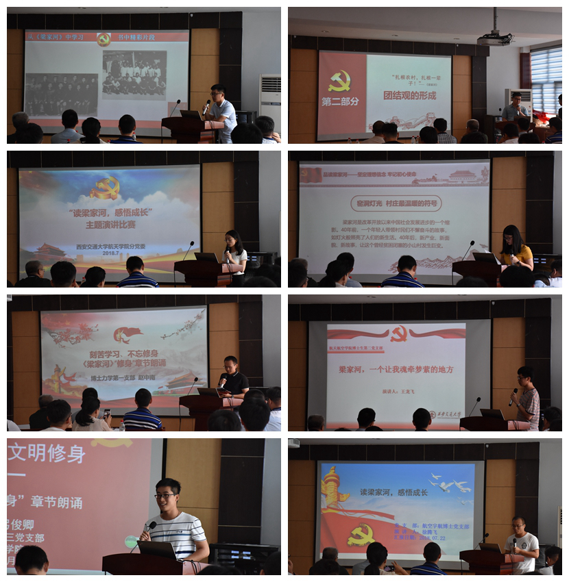 接下来,17级第一党支部的张超同学以“从《梁家河》中学习”讲述了自己在《梁家河》读后的变化;17级硕士第二支支部的吕思豪、干聪、沈超、鲁瑞山四位同学以“梁家河精神,润我心田”分享了青年习近平在梁家河时期的“团结观”及对自己的启示;16级硕士第一党支部的马晓文同学以“经济人+情怀=社会人”讲述了新时代青年更加精确的成长路径;16硕士第二党支部的焦玉雪同学以“品读梁家河,坚定理想信念,牢记初心使命”讲述了总书记在窑洞灯光中的家国情怀;博士力学第一党支部的赵中南同学和博士力学第三支部的刘冉同学生情并茂的诵读《梁家河》的< 修身>篇章,再现了总书记在上山下乡期间对于读书的痴迷;博士力学第二党支部的王龙飞同学以“梁家河,一个让我魂牵梦萦的地方”串连了习近平梁家河上山下乡的学习生活经历,以详实的介绍带领大家设身处地的体会总书记艰辛和困苦的生活;博士航空宇航党支部的徐腾飞以“读梁家河,感悟成长”讲述了自己作为新时代青年重走梁家河的感受。