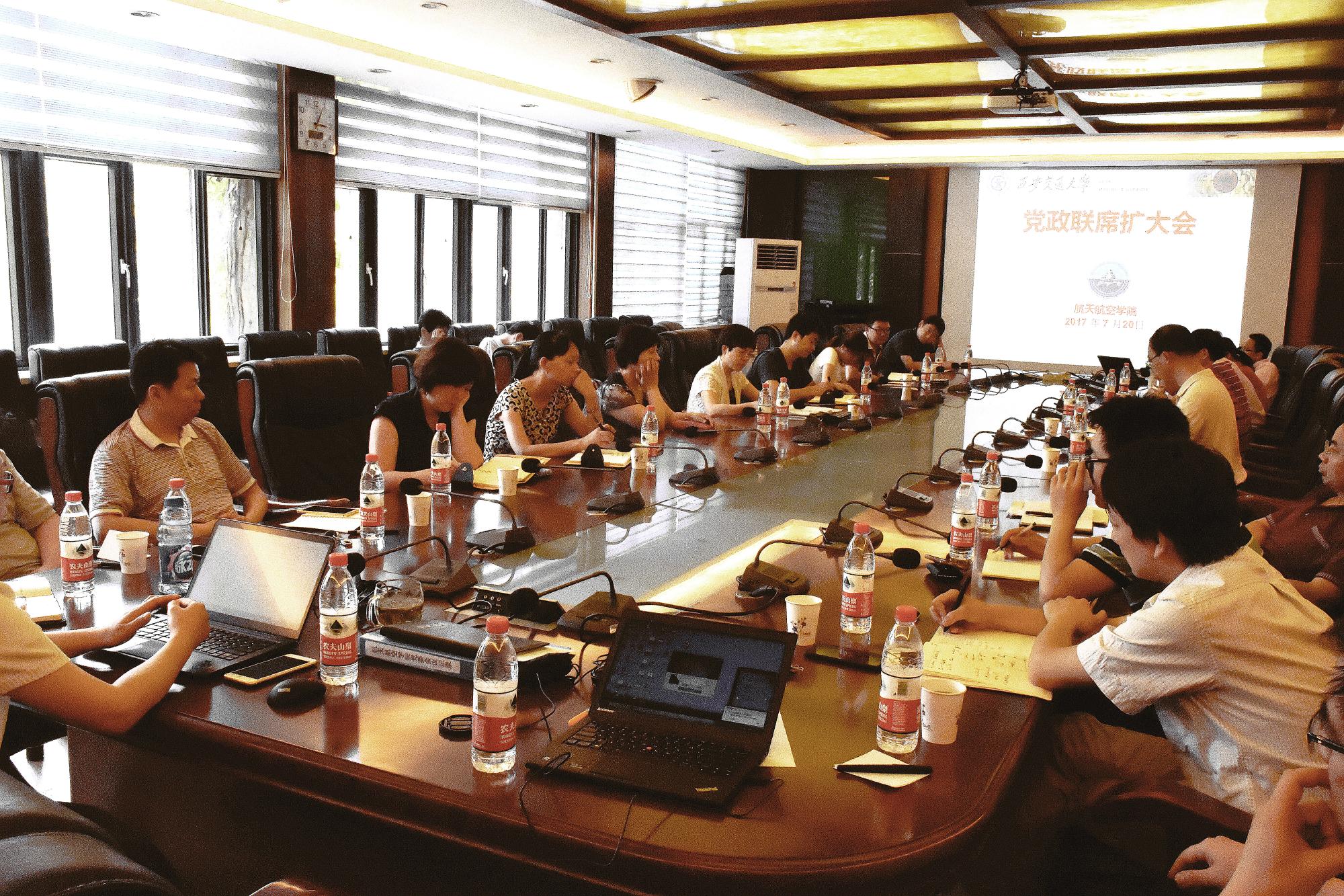 2017年7月20日下午,航天学院召开党政联席扩大会,传达学习学校暑期工作会议精神,同时深入研讨学院“双一流”建设举措及下学期工作思路。参加此次会议的有学院全体党政领导成员,院长助理,各系、实验室、中心主任、副主任,教工党支部书记。会议由学院党委书记徐自力主持。