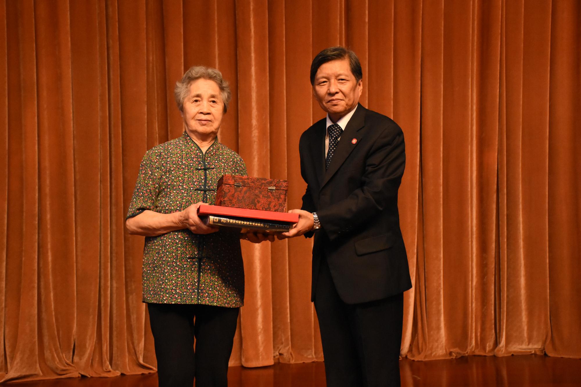 西安交大校长王树国教授代表学校为唐君远教育基金会副秘书长、唐照千教授的妹妹唐新璎女士颁发捐赠纪念铭牌、唐照千教授3D打印塑像以及《20世纪中国知名科学家学术成就概览》。