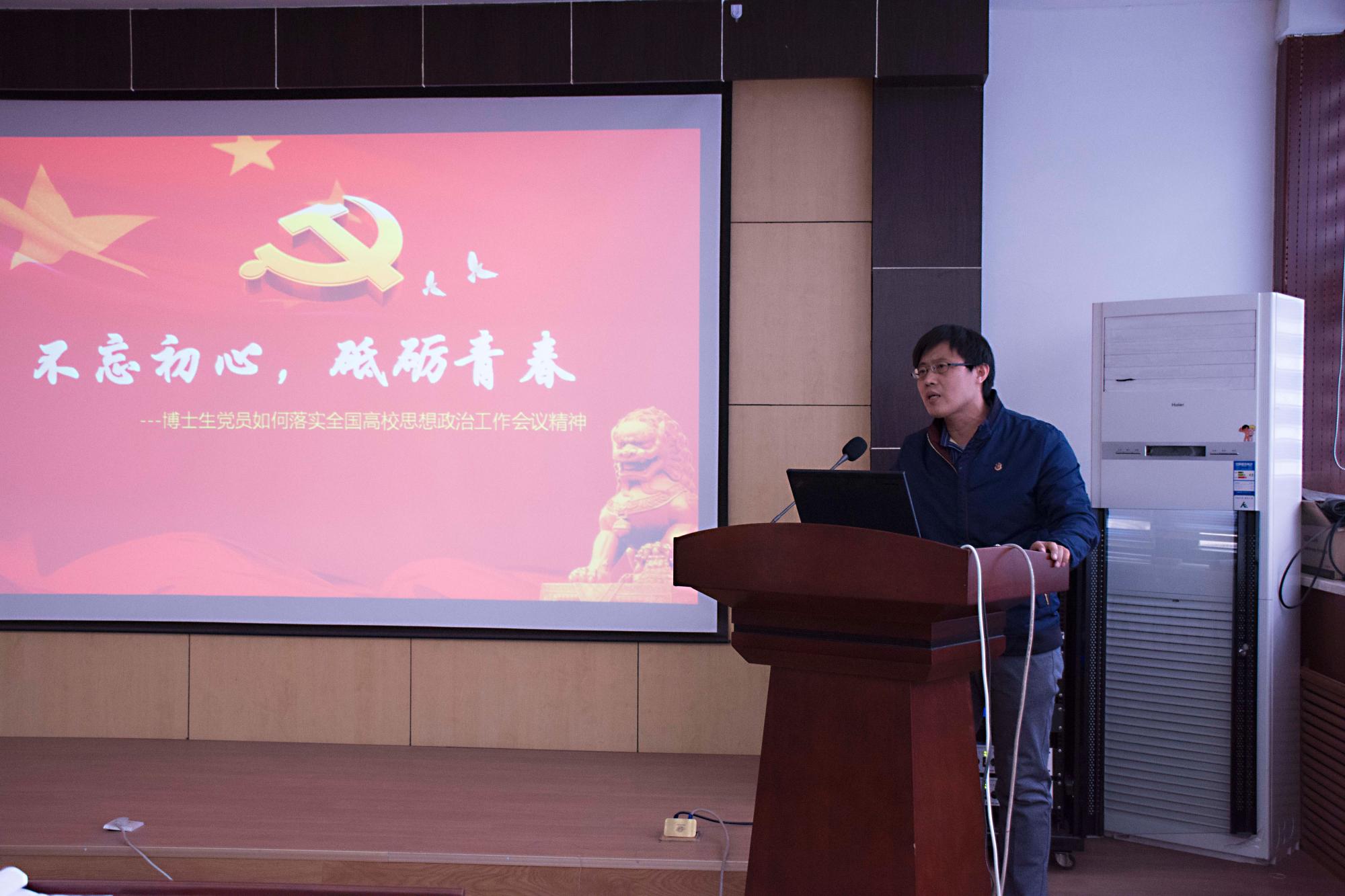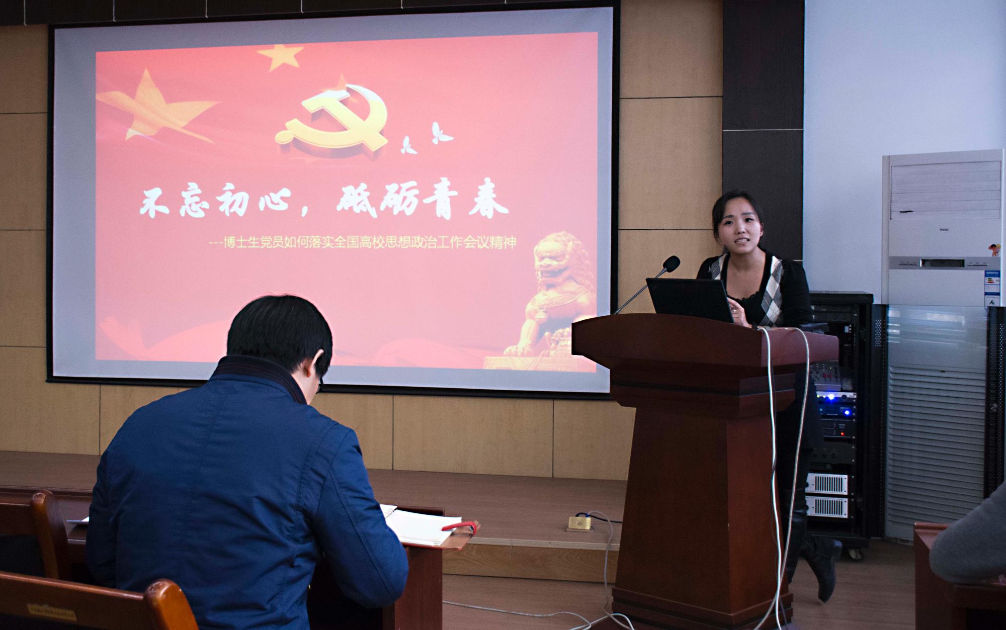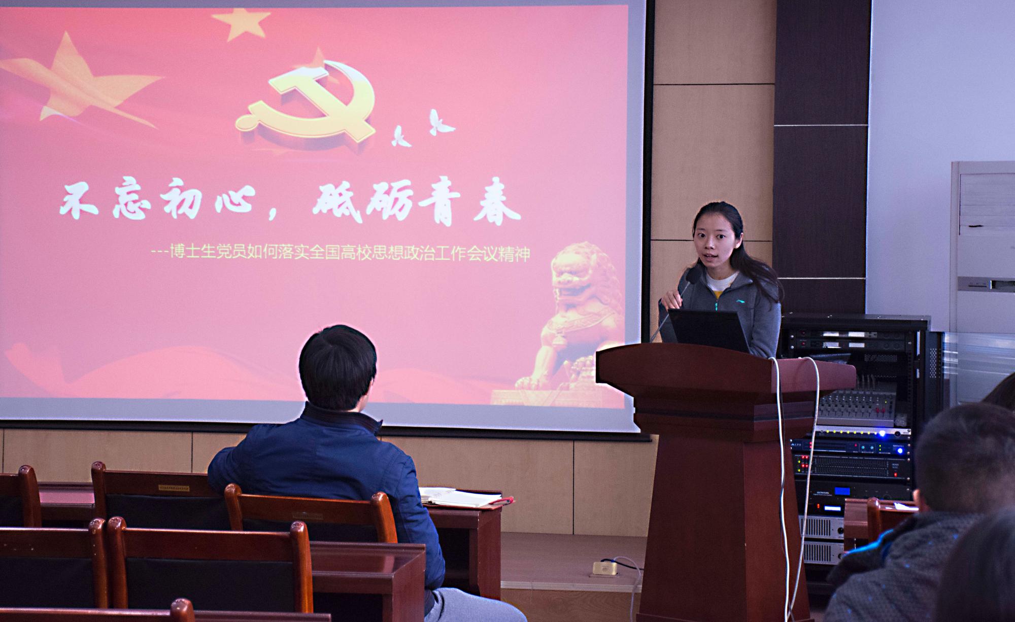 最后,党委副书记陈永华副教授进行了总结讲话,陈书记指出,加强高校思想政治工作,同学们务必立足于“四个服务”并深刻领会“培养什么样的人、如何培养人以及为谁培养人”的重要内涵,这对于自身成长与国家发展都具有重要意义。博士生作为国家科研创新的重要生力军,首要解决的问题就是要正确的认识“个人发展与学科发展,个人发展与支部建设,个人发展与国家需求”之间的关系,只有抓住国家政策走向和国家发展动态,瞄准国家重大需求,充分利用国家、学校、学院资源共享平台,搭建支部交流建设平台,形成合力,方能最大程度的提升自己,才能为社会服务,才能满足国家人才需求。另外,李克强总理在今年两会的《政府工作报告》中特别提到要提高博士生国家助学金标准,足见国家对于博士生这个群体的重视程度,希望广大博士生党员务必立足于国家需求和国家发展,坚持学习习近平总书记系列讲话,加强自身思想政治素养,以学校所倡导的“四个主义”为引领,贯彻好学校提出的“四个一百”,扎实参与支部学习与支部建设,牢记责任使命,真抓实干,加强与各专业,各行业的交流,为国家、社会做出更大的贡献。