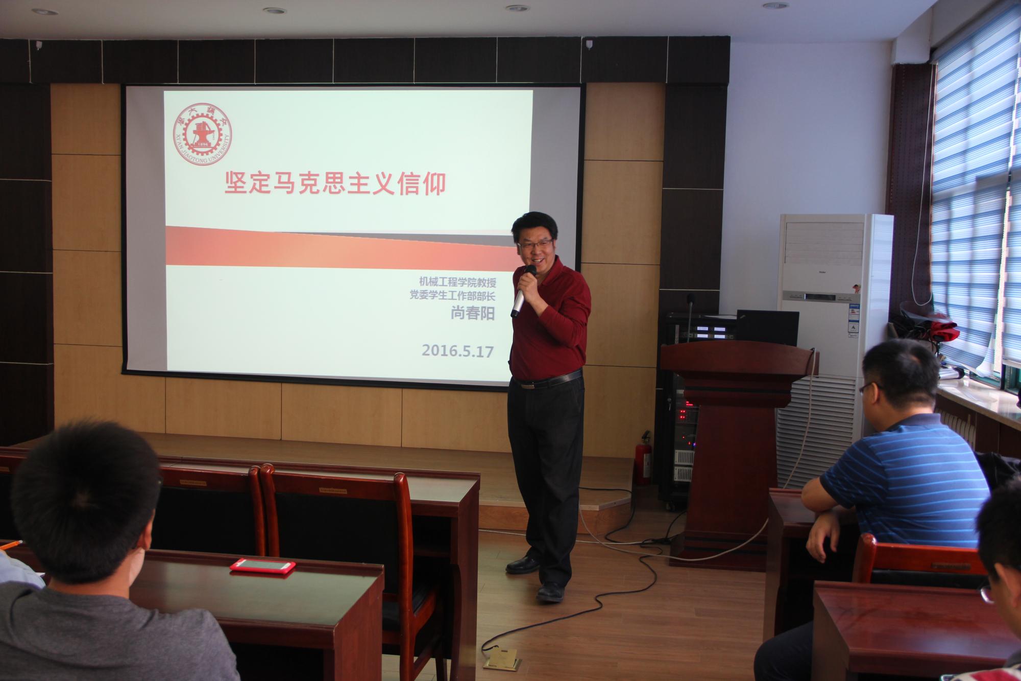 在5月17日下午邀请了大学生党委副书记、党委学生工作部部长、学生处处长尚春阳教授开展了以“坚守马克思主义信仰”为题的“两学一做“专题学习讲座,全体学生党员和学院分党委主持工作副书记徐自力教授、副书记李成杰老师参加了此次党课,大会由李成杰老师主持召开。