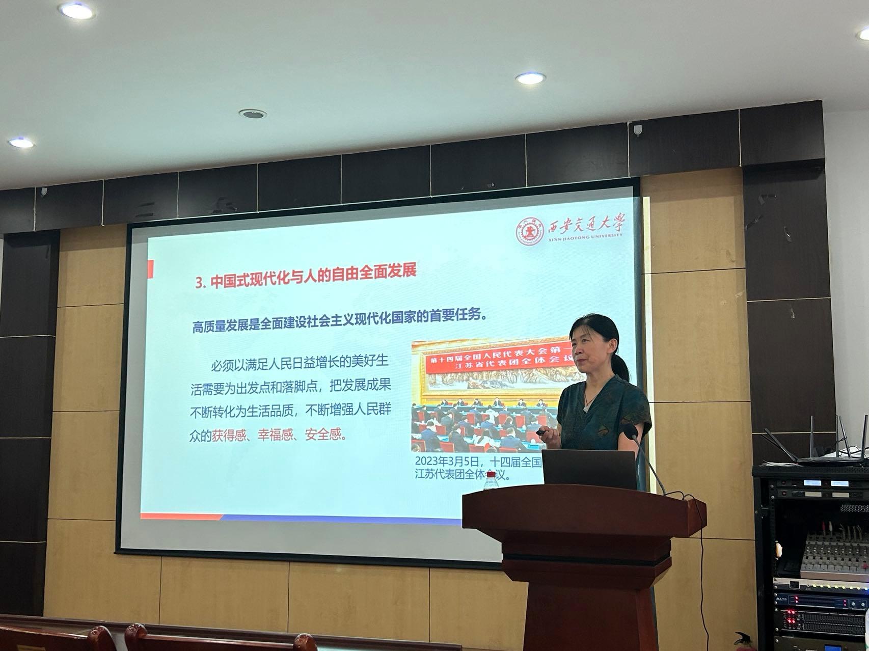 举办了学习习近平新时代中国特色社会主义思想主题教育专题报告会,我校马克思主义学院党委书记苏玉波教授受邀做了题为《中国式现代化的本质蕴涵》的专题报告,学院教工和学生入党发展对象参加了报告会。学院党委副书记李昱静主持报告会。