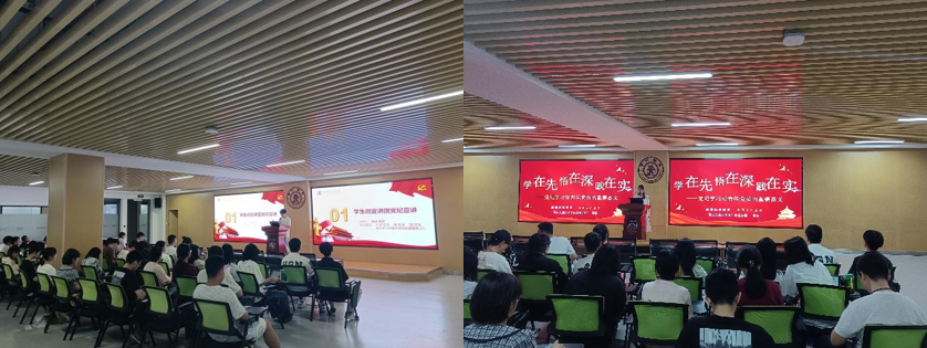 首先,来自校学生微宣讲团的曹蓉领学《中国共产党纪律处分条例》,并作题为《“学”在先、“悟”在深、“践”在实 党纪学习对青年党员的重要意义》的党纪微宣讲。她向与会人员分享到要搞清楚党的纪律规矩是什么,弄明白能干什么,不能干什么,要把学习融入日常,抓在经常。