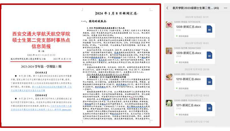 支部深耕理论学习方式方法,注重理论学习日常化、常态化,通过把握重要时间节点邀请宣讲团成员、星航班学员进行专题领学,通过开展“时事热点周周整理、党史校情人人知晓”日常学习汇总工作,由支部成员轮值整理每日时政热点与校园新闻并汇编成册供全体党员学习,累计打卡200余天,材料千余条,形成模范领学,个人自学的良性循环。
