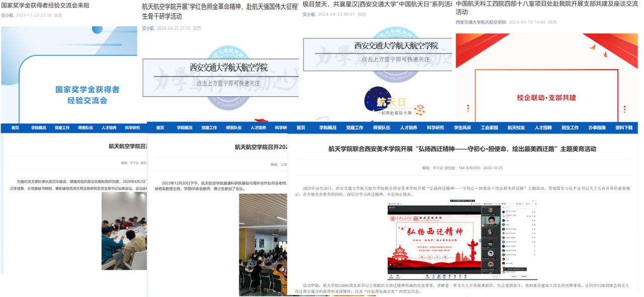 支部组织、协办、参与各类特色活动12项,丰富成员们的日常生活,提高工作的积极性和团体凝聚力,做到凝聚师生有力。协办并参与航天学院博士生党支部与中国航天科工四院四部十八室党支部共建活动、第九届“极目楚天 共襄星汉”中国航天日系列活动,基金撰写培训活动。开展“传承雷锋精神”卫生清扫活动,“学红色照金革命精神,赴航天强国伟大征程”主题参观学习活动,“军地同行,携手并进”交大-空工大博士生学术交流活动,组队参加学院拔河比赛等,展现了支部奋发昂扬的精神面貌。