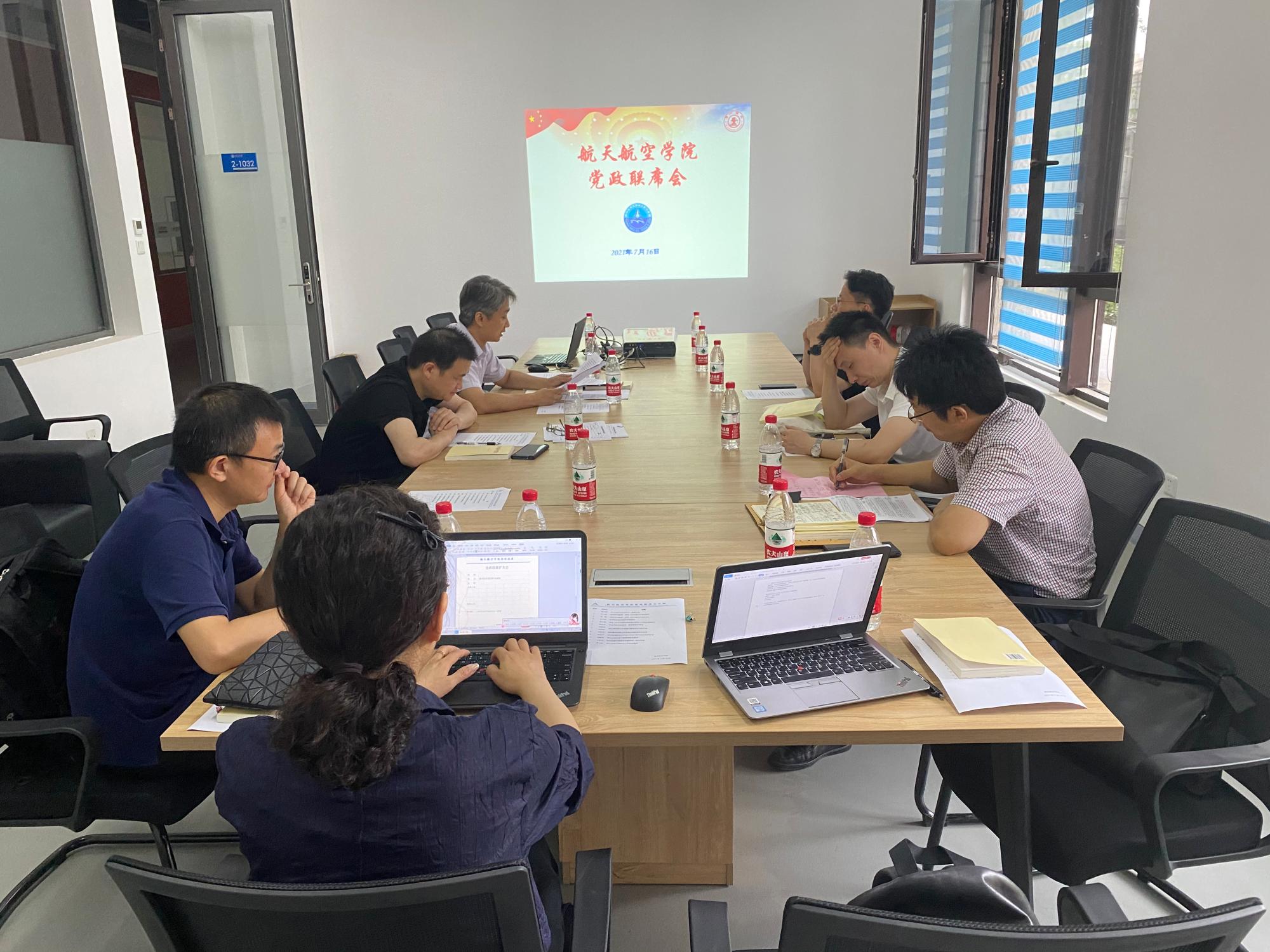 在创新港空天与力学研究院召开党政联席会,专题学习研讨习近平总书记“七一”重要讲话精神。学院党政领导、党委委员参加了会议。学院党委书记李小跃主持会议。