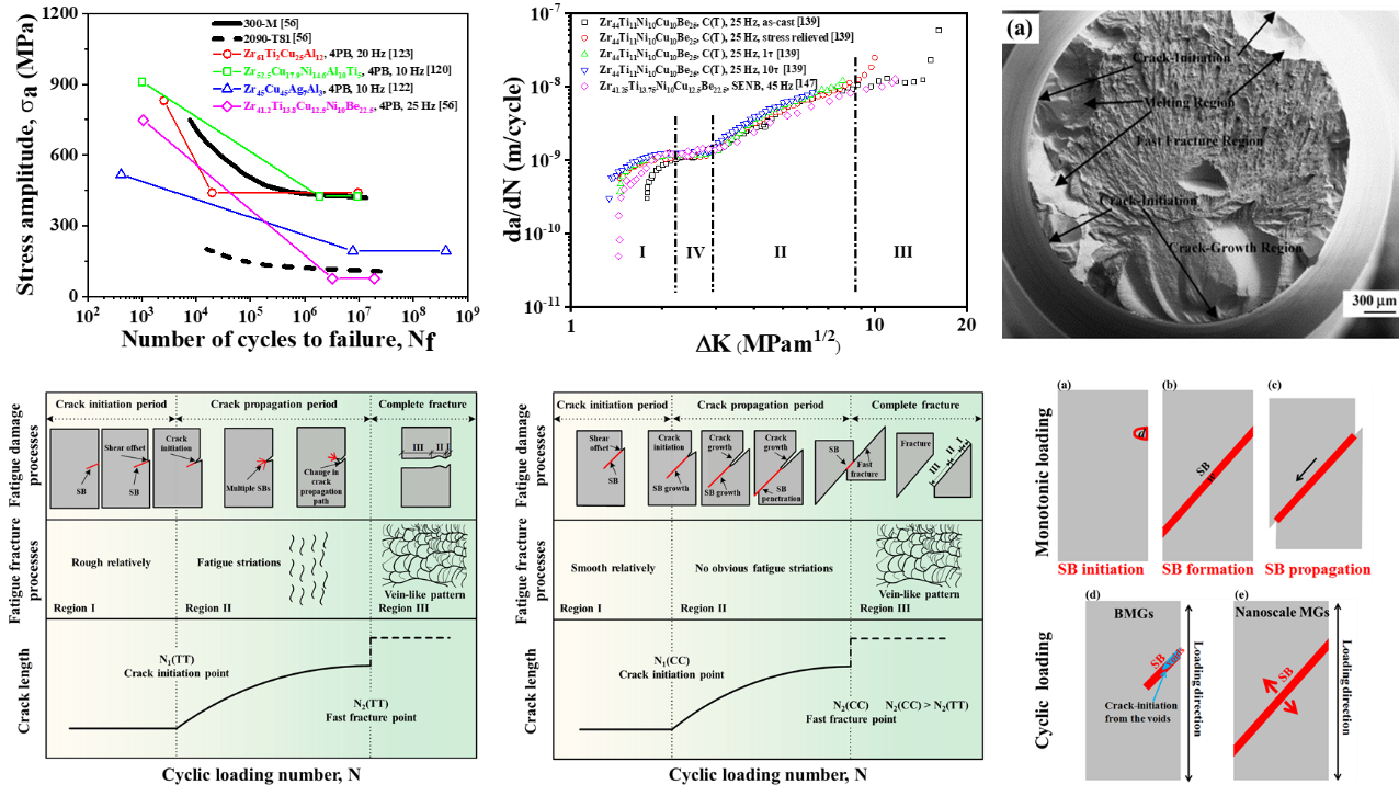 该综述论文总结了宏/微观金属玻璃疲劳断裂的实验和模拟研究进展。首先,基于疲劳寿命曲线、疲劳裂纹扩展和断面形貌,总结了金属玻璃疲劳行为的实验进展,重点讨论了化学组分、加载频率、加载条件、试样尺寸、自由体积对疲劳寿命、疲劳裂纹扩展速率、断面形貌以及疲劳失效机制的影响规律。其次,总结了金属玻璃疲劳方面的模拟研究进展,包括循环加载下试样尺寸效应、加载频率的影响规律,重点讨论了原子层面上剪切转变区的演变规律以及剪切带的形成传播机理。