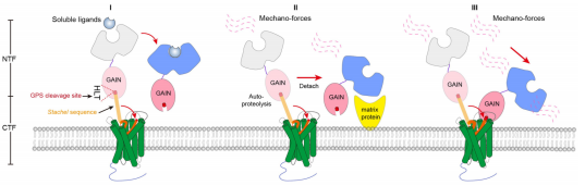 与GPCR家族其他成员相比,aGPCR具有显著的结构特征,包括复杂的多结构域的N端胞外区域(Extracellular region)以及可以发生自水解的GPCR蛋白酶自水解诱导(GPCR autoproteolysis-inducing, GAIN)结构域,其中包含保守的GPCR水解位点(GPCR proteolysis site,GPS)。绝大多数aGPCR成员可以自发在GPS位置发生自水解,产生α和β两个亚基,其中α亚基为细胞外区域(NTF),β亚基为包含七次跨膜螺旋区域(CTF),水解后的NTF与CTF在细胞表面保持非共价相连。aGPCR自水解后,其β亚基最N端的区域被称为Stachel序列(德文中的“针刺”)。研究表明aGPCR可以感受外界多种不同信号刺激而具有截然不同的激活模式,例如可以被细胞内液体流动或者震动等机械力激活,被可溶的小分子或者蛋白配体激活等。