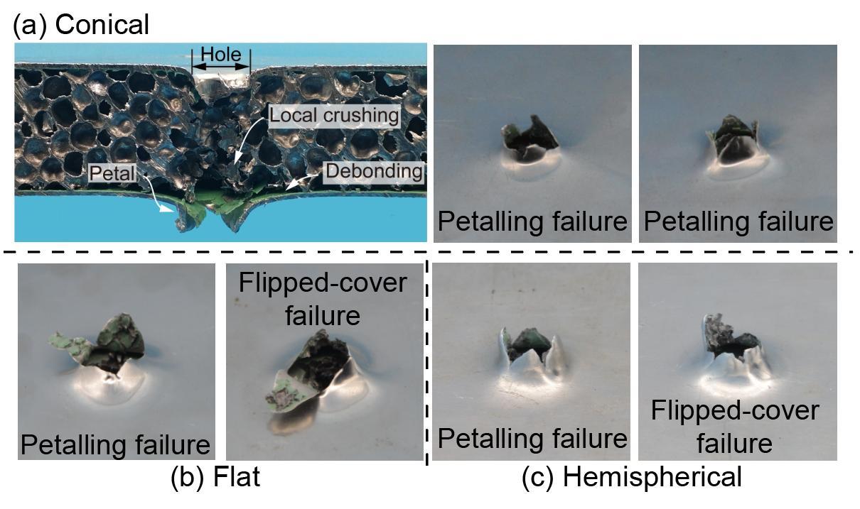 图2 不同形状弹体侵彻金属泡沫夹芯复合防护结构的破坏形貌