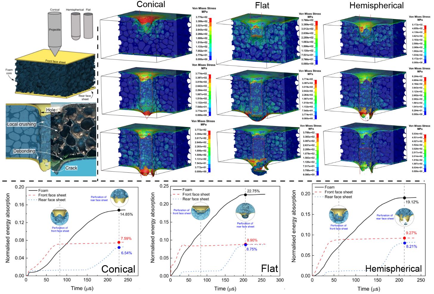 秦庆华教授和新加坡国立大学Poh L.H. 教授针对三明治金属泡沫夹芯复合防护的弹道极限问题,系统地开展了三明治夹芯复合防护结构的高速冲击破坏实验(图1),获得了平头、球头及锥头弹体的入射速度、剩余速度以及夹芯复合防护结构被贯穿后的破坏形貌等重要实验数据(图2);提出了泡沫芯材层细观结构重构的高精度新算法,建立了夹芯复合结构跨尺度弹道冲击数值模型(图3);以实验结果导引,提出了三明治夹芯复合防护结构刚性弹体侵彻动力学新理论模型(图4)。研究获得了高速弹体冲击下夹芯复合防护结构的多种新失效模式,揭示了高速弹体侵彻下三明治夹芯复合结构的能量耗散机制,阐明了三明治复合夹芯结构各组成部分的能量分配原理,提出了以复合防护结构抗弹能力为驱动的夹芯复合防护结构质量分布设计策略,回答了在相同面密度条件下如何设计芯材可压缩三明治复合防护结构的迎弹面板和背面板的问题。研究结果表明,较厚的迎弹面设计有利于提高复合防护结构的抗弹性能。