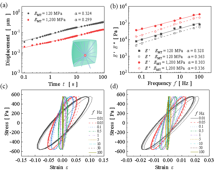 力学在生物体发育过程中扮演着重要角色,随着细胞生物学的快速发展,力学因素在细胞尺度上的调控作用受到越来越多的关注。在不同类型、不同状态的活细胞粘弹性响应中(图1),存在着一个统一的标度律响应。尽管已有非常多的模型用于探究细胞的流变学行为,然而,细胞标度律响应是如何自发产生的?力学在其中扮演什么样的角色?标度律指数中又蕴含着什么样的物理规律?这些问题至今尚不清楚。