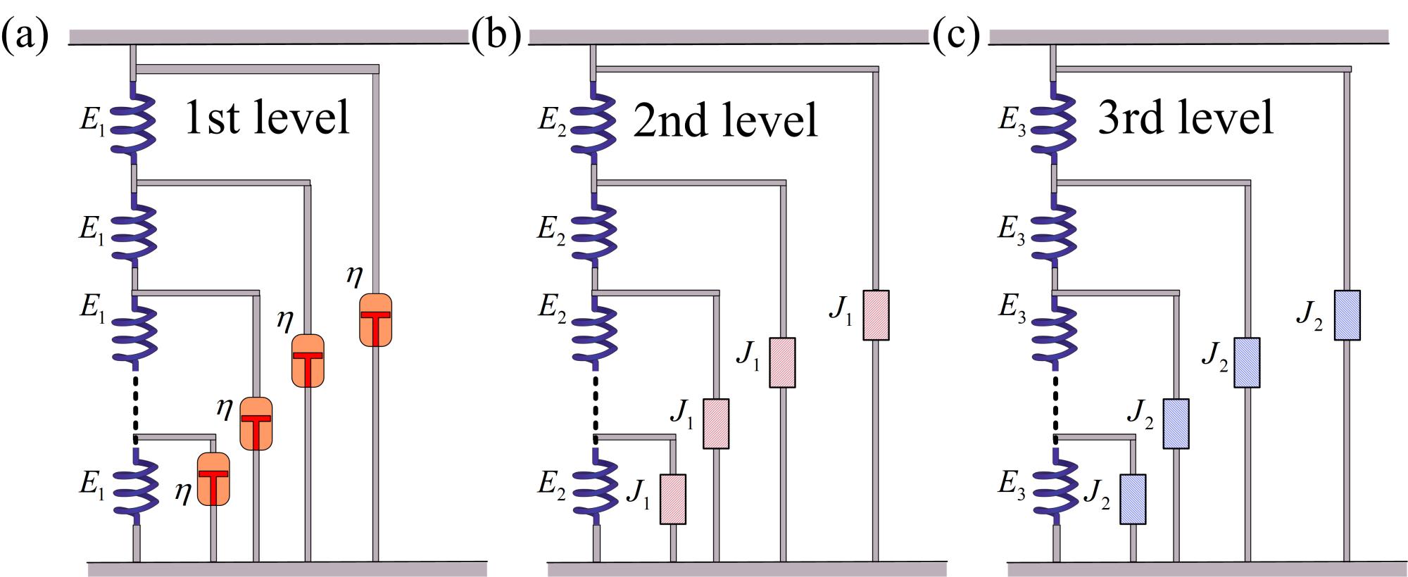 航天学院徐光魁教授团队通过考虑细胞诸多组分的细胞结构建立了揭示活细胞标度律流变学响应机制的自相似多级结构模型(图2),并受结构模型启发,建立了自相似的多级结构理论模型(图3),揭示了标度律流变学的形成机制,发现了细胞刚度在标度律指数变化中的调控作用,给出了标度律指数与细胞刚度的统一关系以及相应的物理规律。不仅可以自发地再现蠕变柔量随时间或复模量随频率变化的标度律响应规律,还实现了标度律指数与细胞刚度的普适关系。模型预测结果与不同类型的细胞、不同状态的细胞实验数据都相吻合。该研究表明,细胞材料普适的标度律响应主要取决于其统一的结构特征,而不是具体的分子特性。该项研究不仅可以为生物组织材料的仿生设计和应用提供理论基础,还可以为医学诊断、药物开发以及预后评估提供新的思路和理论指导。