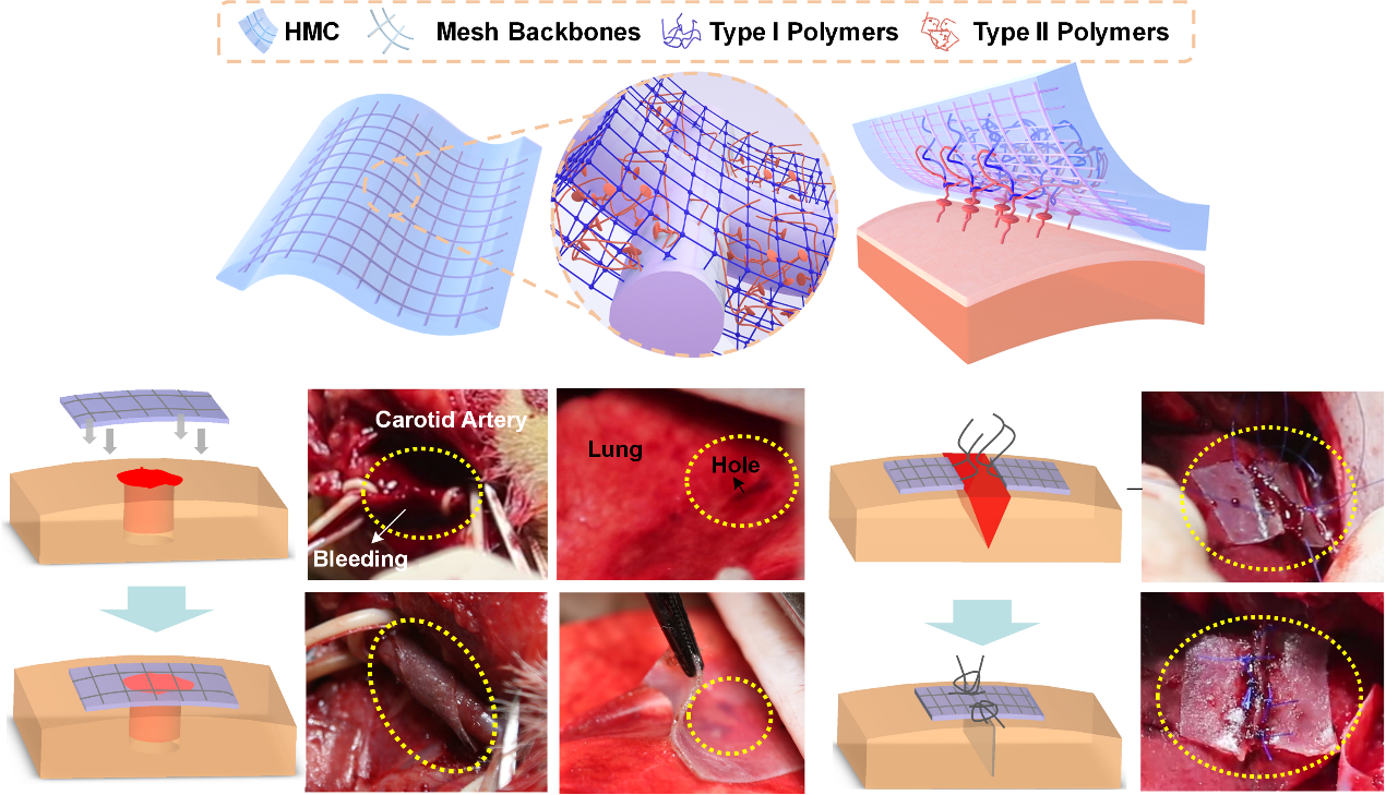 软机器实验室研究人员卢同庆教授及高扬副教授与哈佛大学锁志刚院士提出了一种水凝胶复合补片医用新材料(Hydrogel-mesh composite, HMC)。通过将抗溶胀组织黏附水凝胶与外科补片以宏观拓扑互穿结构进行复合,得到的水凝胶复合补片在与组织形成强粘接的同时,还综合了水凝胶及外科补片的优点,如生物相容性、对水及小分子的可渗透性,高的面内刚度及低的弯曲刚度等。这种水凝胶复合补片在组织修复、密封、止血和无缝线创口闭合方面,特别是在承受高应力组织之上的应用中表现出巨大潜力。