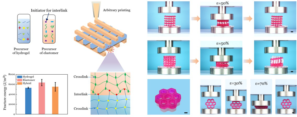 软机器实验室研究人员与哈佛大学教授合作提出一种软结构3D打印的强韧粘接技术,实现了具有超强界面粘接的水凝胶/弹性体亲疏水异质结构的打印。