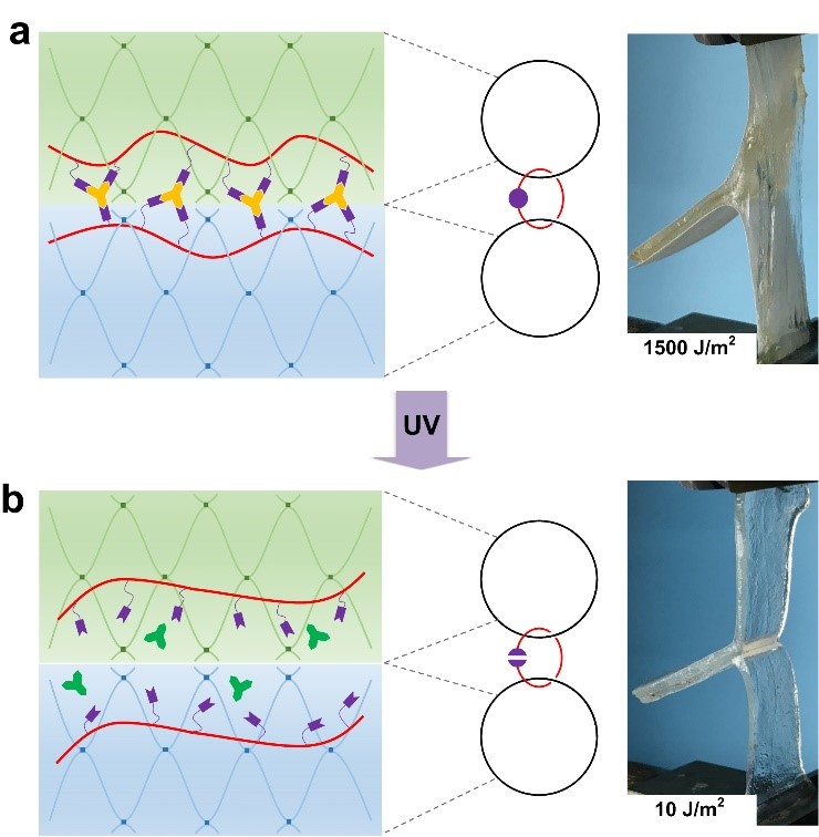 软机器实验室研究人员高扬博士等与哈佛大学教授合作成功实现了光响应的可拆卸粘接。他们基于“拓扑粘接”思想,通过在界面引入一层光响应的离子交联聚合物网络与粘接物自身网络间形成拓扑缠结来实现强韧粘接,该交联聚合物网络在自然光条件下可稳定保持,而在60 mW/cm2的365 nm紫外光照下可迅速解离,使得粘接能可在3分钟内下降超过90%,从而实现了光响应的高效脱粘性能。他们提出了该交联聚合物网络与不同基底材料间相互联结的三种基本模型并在此基础上实现了水凝胶、生物组织、弹性体及无机固体等不同类型基底材料间的光响应可拆卸粘接。