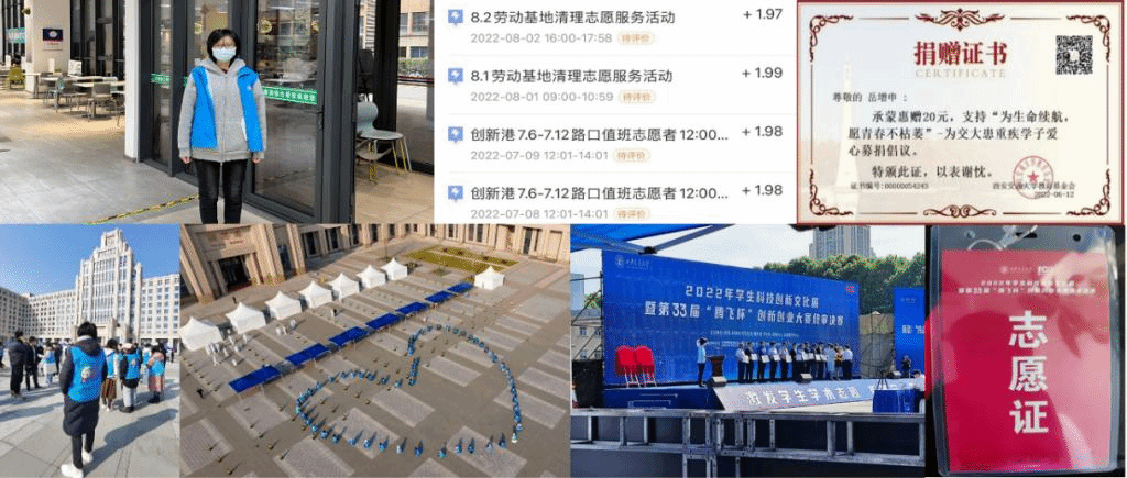 予人玫瑰,手有余香。从劳动基地清理到路口值班,从“腾飞杯”创新创业大赛志愿者到为交大重疾学子爱心募捐,支部多名成员积极参与多项志愿服务活动,树立价值导向,引领文明风尚,争做志愿服务精神践行者。新冠疫情期间,支部成员积极参与学院和学校的抗击疫情志愿服务工作,协助核酸检测、分发爱心企业捐赠物资等,亮明党员身份,彰显榜样力量,争当志愿服务活动排头兵。志愿服务人人可为、事事可为、时时可为,支部成员积极参与,从自身做起、从身边小事做起,用智慧服务社会,用行动传播爱心。