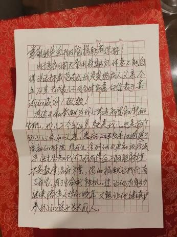 捐献完成后,由于患者还在接受治疗,患者的父亲写下感谢信,尽管已经72岁高龄,但信中的笔迹却难掩其激动之情。信中写道:“我儿子是两个孩子的父亲,您让他有能力继续陪伴父母的晚年,又能让他继续抚养孩子长大成人。”胡旭表示:“我看了之后也非常感动,给人的生命一个新的机会,可能就是捐献造血干细胞的意义吧。”
