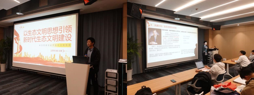 航天学院王思琦同学进行党的二十大精神专题领学,他结合习近平总书记从梁家河到上海工作期间对于生态文明建设的各项举措,详细讲述了习近平生态文明思想的形成过程、科学内涵和理论贡献,并深入探讨新时代深入贯彻习近平生态文明思想的深刻意义,倡议同学们胸怀国之大者,坚持思想引领、系统观念、内外联动,践行绿色发展理念。