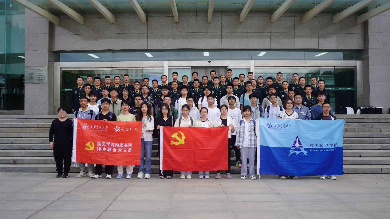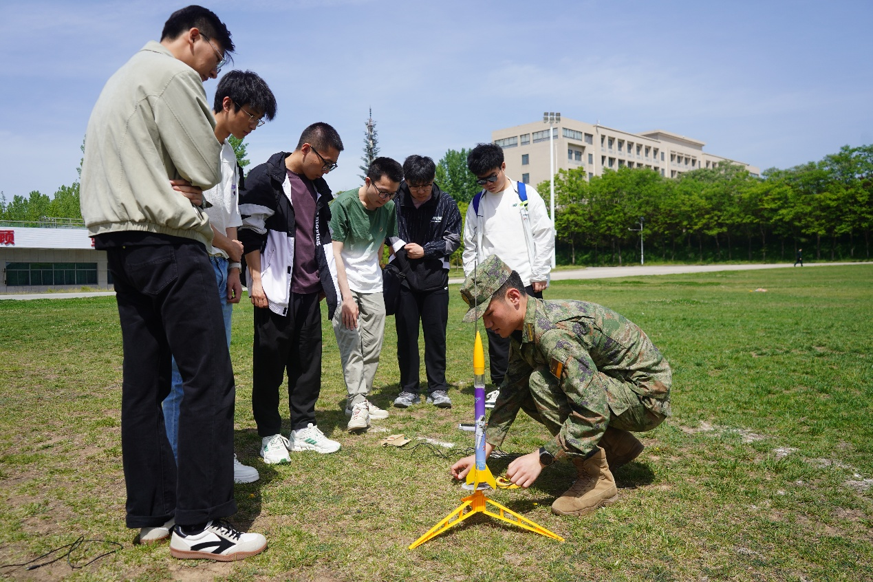 活动伊始,在火工大校方代表的热情接待下,同学们首先参观了该校的航模俱乐部。作为火工大特色学生社团之一,航模俱乐部以“创新驱动、服务实战”为理念,展示了多款自主研制的航模作品,这些作品不仅融合了空气动力学、电子控制等前沿技术,更体现了军事科技与工程实践的深度结合;随后的飞行表演环节,无人机以精准的打击、高难度的特技动作赢得阵阵喝彩。压轴登场的是模拟火箭发射演示,西安交大学子在火工大同学的指导下亲自完成发射操作,当模型火箭拖着尾焰直冲云霄时,现场爆发出热烈掌声。这些展示既体现了军事科技创新的丰硕成果,也展现了军校学员扎实的工程实践能力,为师生们呈现了一场精彩绝伦的航空航天科技盛宴。