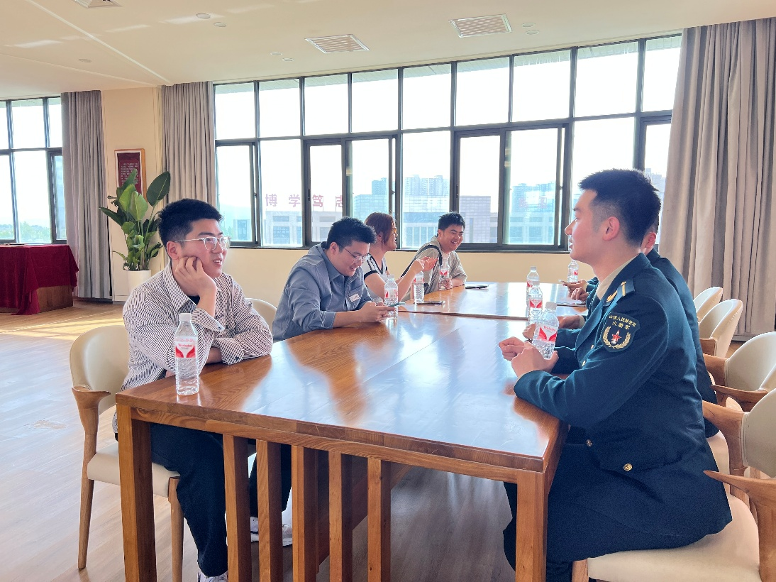 在图书馆举行的座谈会上,两校学子首先观看了火工大精心制作的宣传片,荧幕中,先进的武器设备气势恢宏,彰显着大国重器的威严,火箭军战士们英姿飒爽,表现着人民军队的威武。而后,围绕"新时代航天与国防人才的使命与担当"主题展开热烈讨论。军校学员分享"科技+军事"的复合型培养模式,地方高校学生交流前沿科研动态,双方在思维碰撞中深化理解,同时也就生活习惯与学习模式差异展开了亲切交流。火箭军工程大学学员熊远聪表示:"地方高校的创新思维值得我们学习。"西安交大硕士生段定骁则说:"军校学员的纪律性和执行力令人敬佩。"