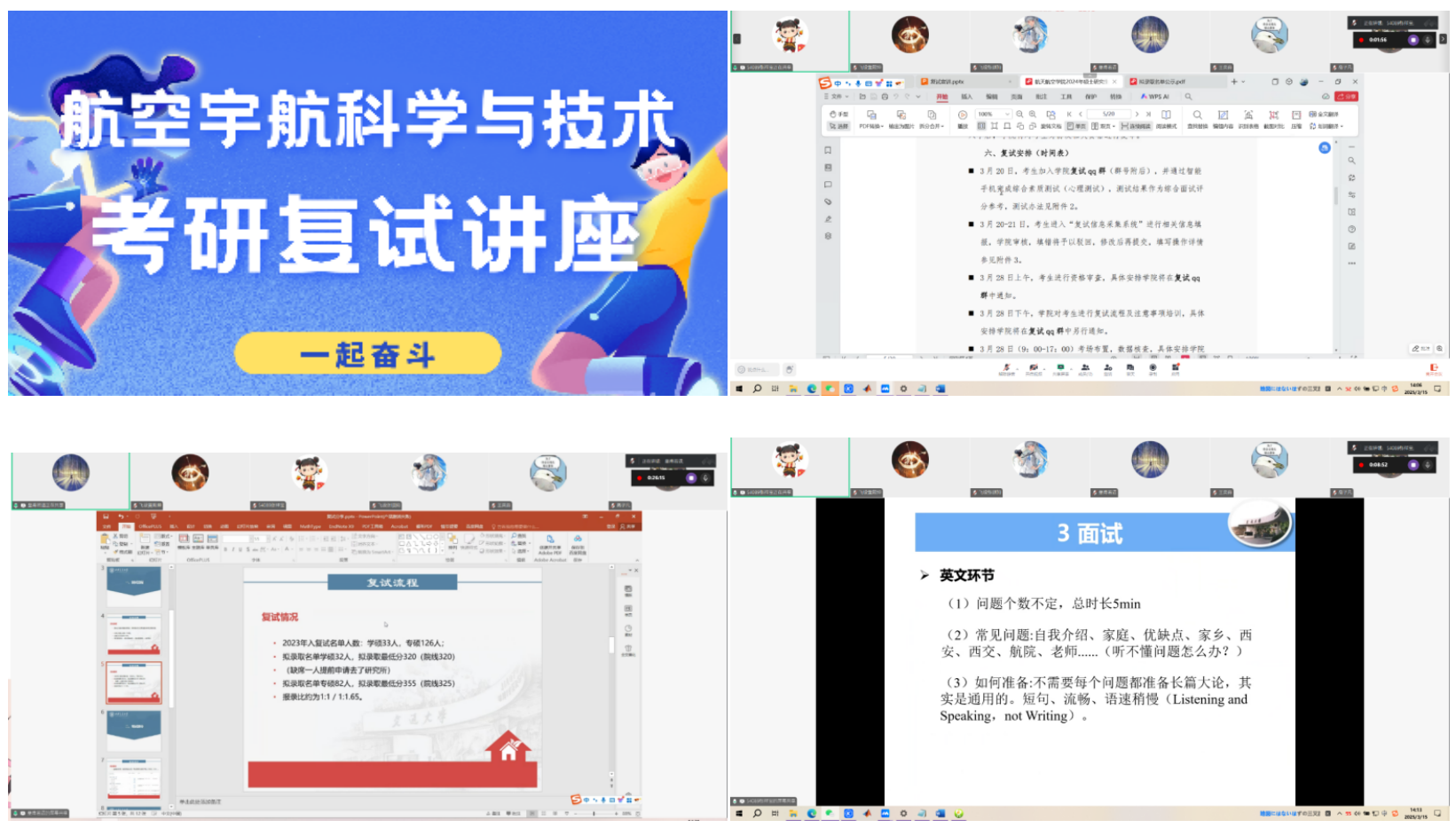 宇航专场邀请到来自2024级硕士生第四党支部的张祥宝、皇甫若适两位同学作经验分享。张祥宝着重于复试整体流程、科目复习要点及面试准备策略的介绍,通过解读复试相关文件,以自动控制原理综合科目为例,分享了专业课的学习方法和考试技巧,以及中、英面试的准备及应答策略。皇甫若适则聚焦于复试细节,详细介绍了复试成绩占比和学硕、专硕的报录比差异,并强调了学硕、专硕各自的竞争激烈程度,以及复试面试时英语自我介绍和思想品德考核时的应对策略。