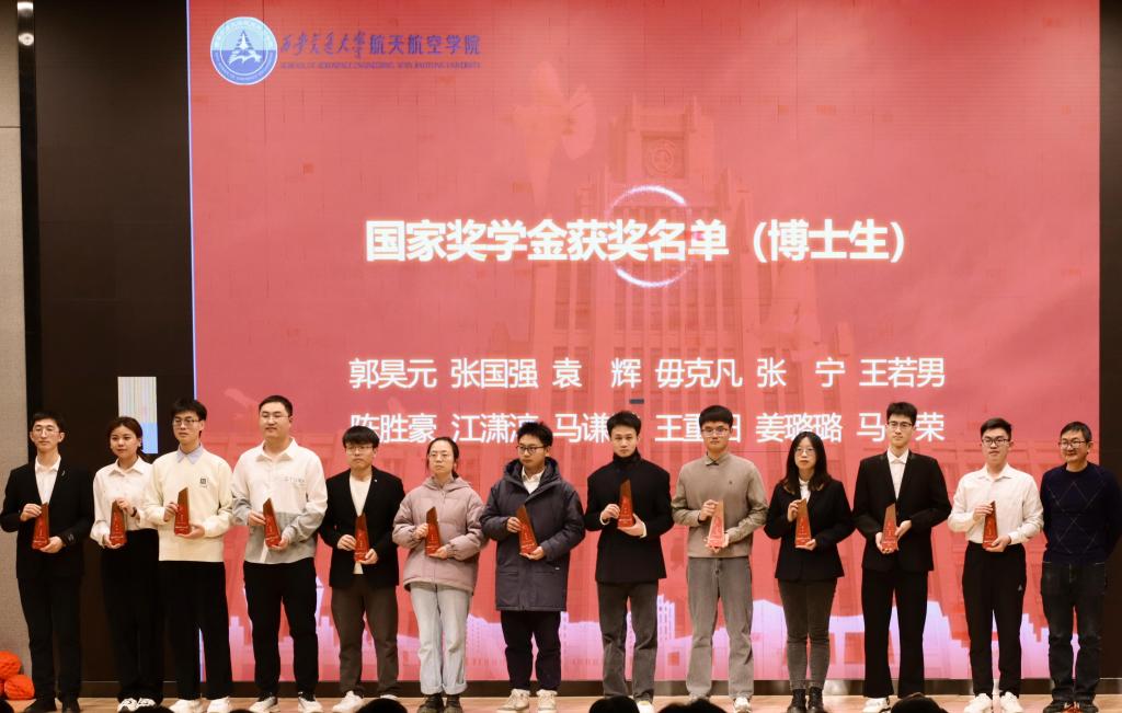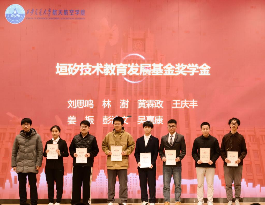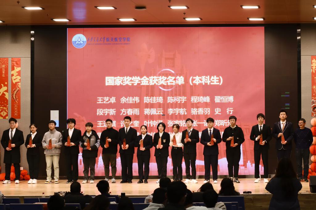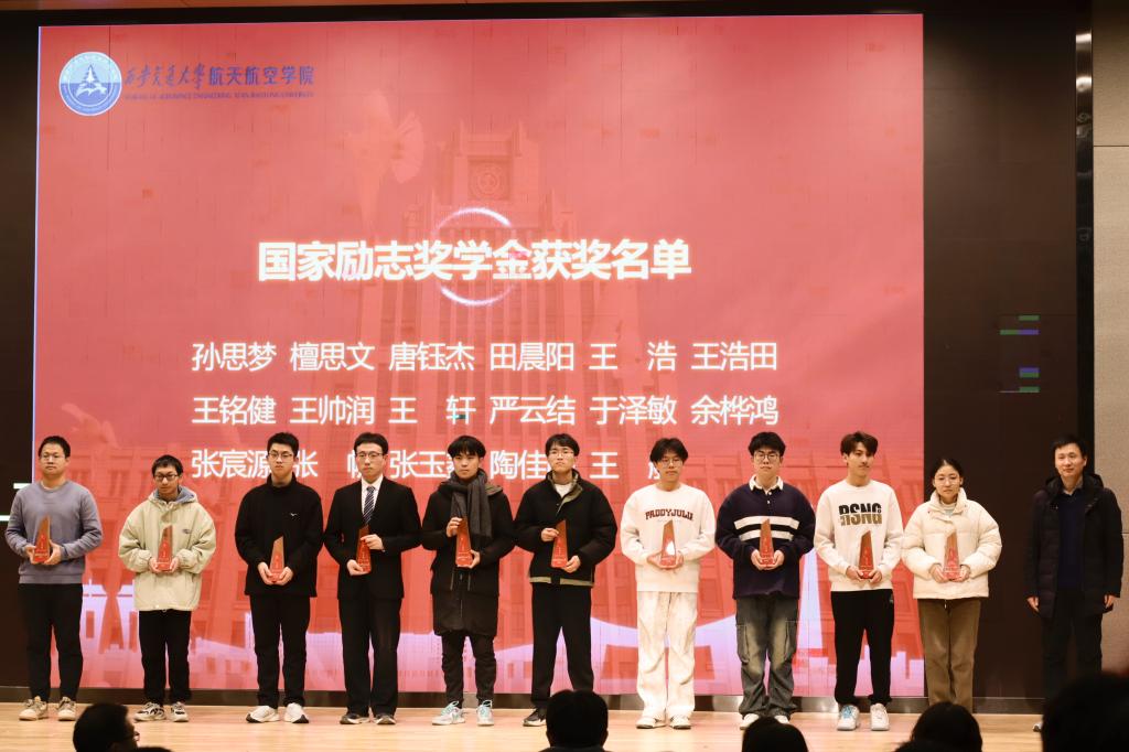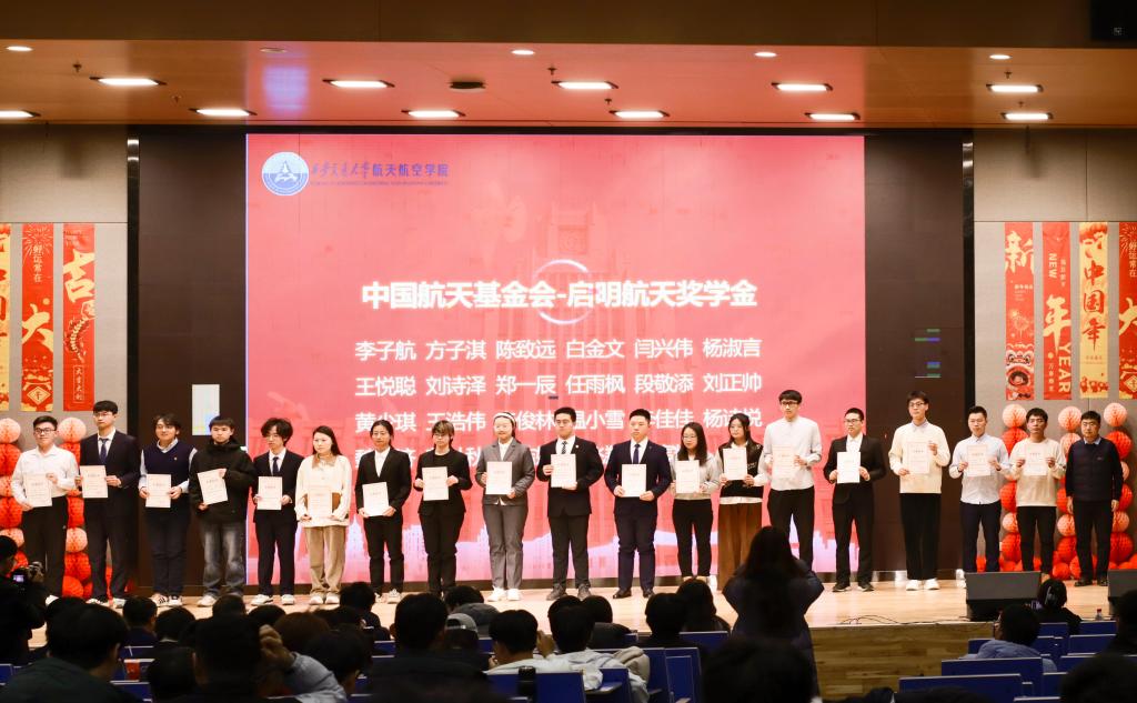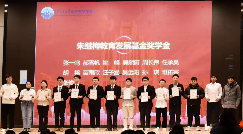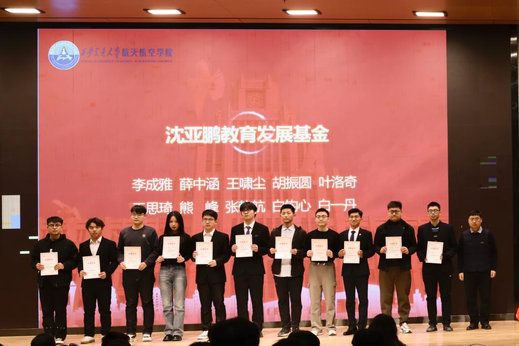 王正锦、张虎分别为获得中国航天基金会-启明航天奖学金、沈亚鹏教育发展基金奖学金以及朱继梅教育发展基金奖学金、垣矽技术教育发展基金奖学金的同学们颁奖。