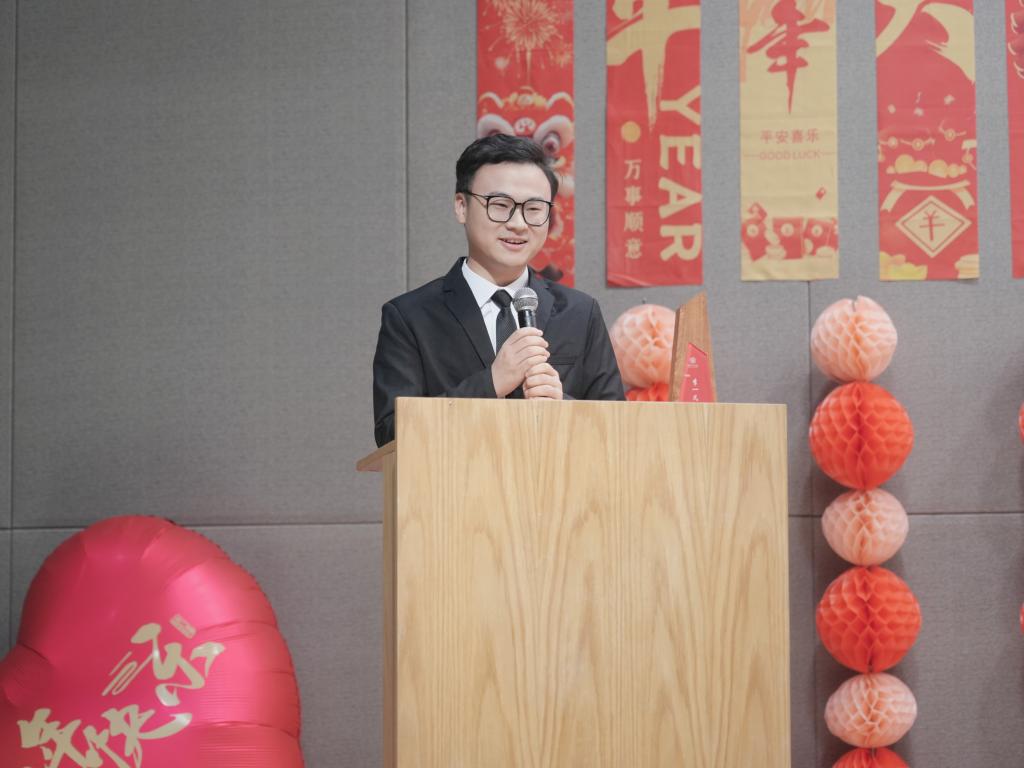 李一凡代表发言。他深刻表达了对导师及学院的感激之情,分享了他在研究生阶段的成长经历,并鼓励在座的同学们:要将这份感激化为动力,努力在科研领域不断突破自我,争取为社会和科学的发展贡献力量。