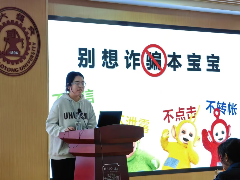 王若宜针对电信诈骗展开安全知识宣讲,以社会中发生的实际案例与电信诈骗数据全方面讲解了目前社会上的诈骗手段,提醒同学们做到“不轻信,不泄露,不点击,不转账”,树立科学的消费观,增强防范,谨防诈骗。