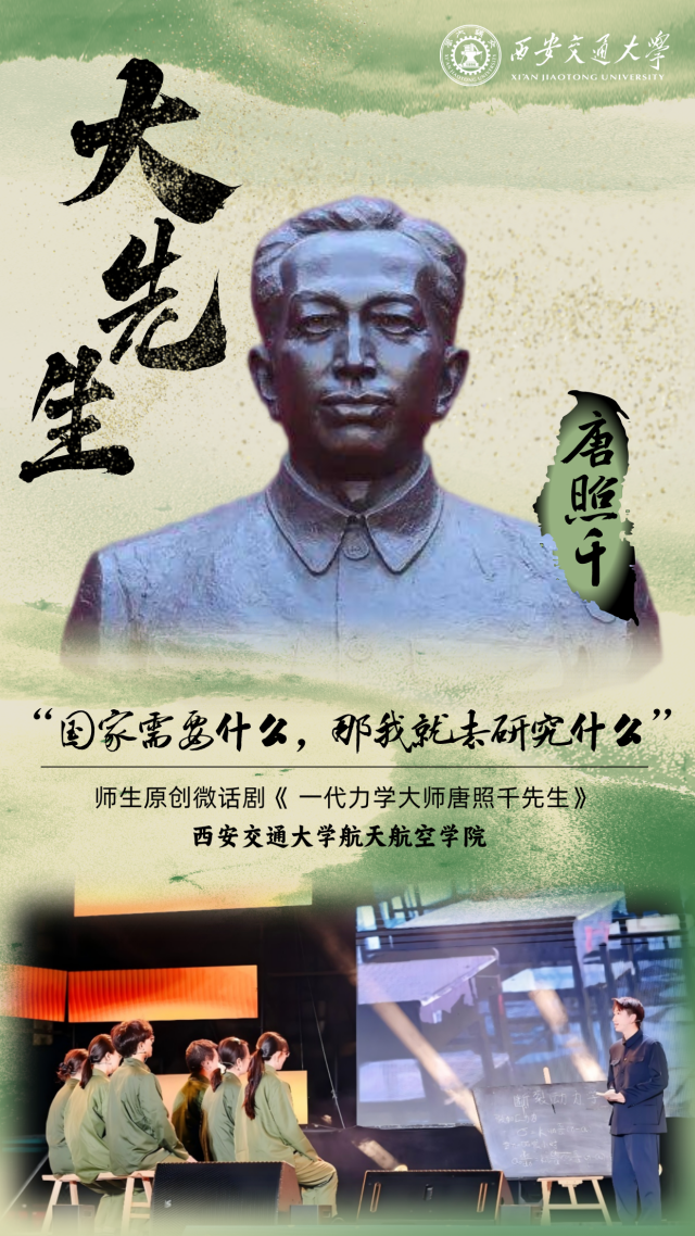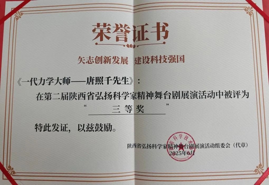 6月11日,《一代力学大师唐照千先生》在第二届陕西省弘扬科学家精神舞台剧展演活动中荣获三等奖。该话剧以我国著名力学家、教育家唐照千先生的生平事迹为原型,由航天学院师生自编自导自演,以研究生为主体、以学院为单位,挖掘演绎大师故事,感悟大师风范,通过艺术形式生动再现了唐照千先生严谨治学、献身科研的崇高精神。
