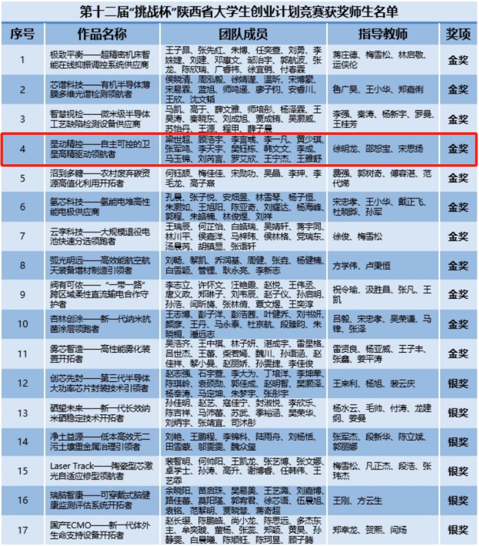 67日,第十二届“挑战杯”陕西省大学生创业计划竞赛闭幕式暨颁奖仪式在西北农林科技大学举行,本次竞赛由共青团陕西省委、中共陕西省委教育工委、陕西省人民政府国有资产监督管理委员会、陕西省科学技术协会、陕西省学生联合会、陕西省西咸新区开发建设管理委员会主办。我校共有17个项目入围决赛。其中,航天学院“星动精控——自主可控的卫星高精驱动领航者”斩获金奖。