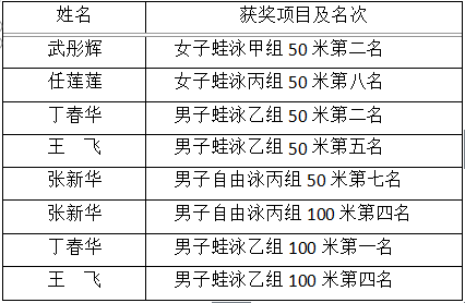 2017年7月15日上午,“2017年色情网 “思源物业杯”教职工游泳比赛在我校兴庆校区游泳馆举行,比赛以甲、乙、丙三个年龄段划分,分男子组、女子组4大类项目进行。在院工会的积极组织和协助下,我院派出了由任莲莲,武彤辉,张新华,王飞和丁春华五名老师组成的代表队,分别参加了不同组别多个项目的的比赛。健儿们在泳池中劈波斩浪、奋力争先,分别在各自的项目中取得了佳绩。获奖名单如下。