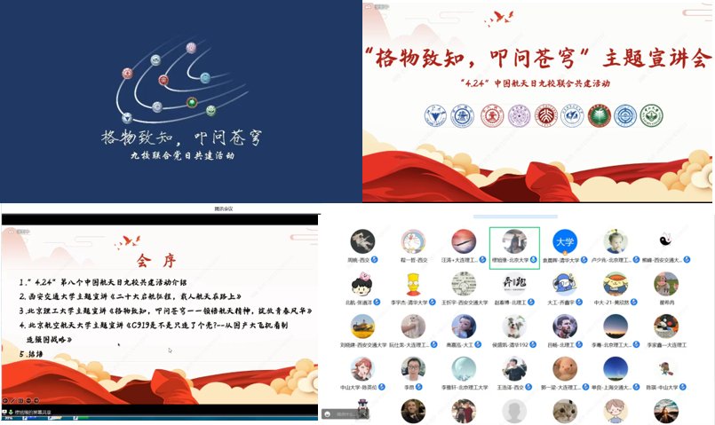 航空航天2022级硕士第四党支部、中山大学法学硕士党支部共同开展了中国航天日主题党日活动,希望能够整合各地的优势资源,分享支部建设方面的经验,促进各校的之间的交流和合作。本次宣讲活动采取线上的方式进行,来自9个学校的190余名学生党员参与观看。