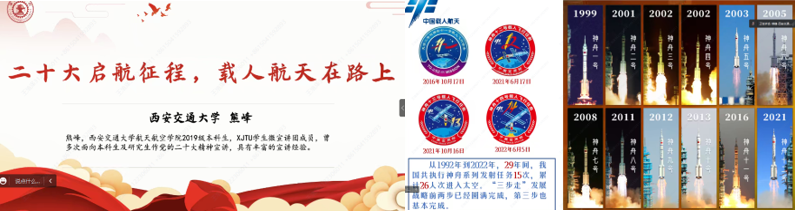 2019级本科生熊峰从忆征程,在征程,启征程,我们的太空四个方面,回顾过去,了解现在,展望未来。启航星辰大海,从无到有,从神舟1号到神舟15号,中国载人航天事业取得了非凡的成就,创造了辉煌的历史。接着分析了中国航天能取得如此瞩目成就的原因,熊峰同学指出,新征程上,新挑战与新机遇并存,我们青年学子要有使命感与责任感,发扬特别能吃苦,特别能战斗,特别能攻关特别能奉献的伟大载人航天精神,担当起航天,建设的时代使命,聚起中国在航天事业的荣光。