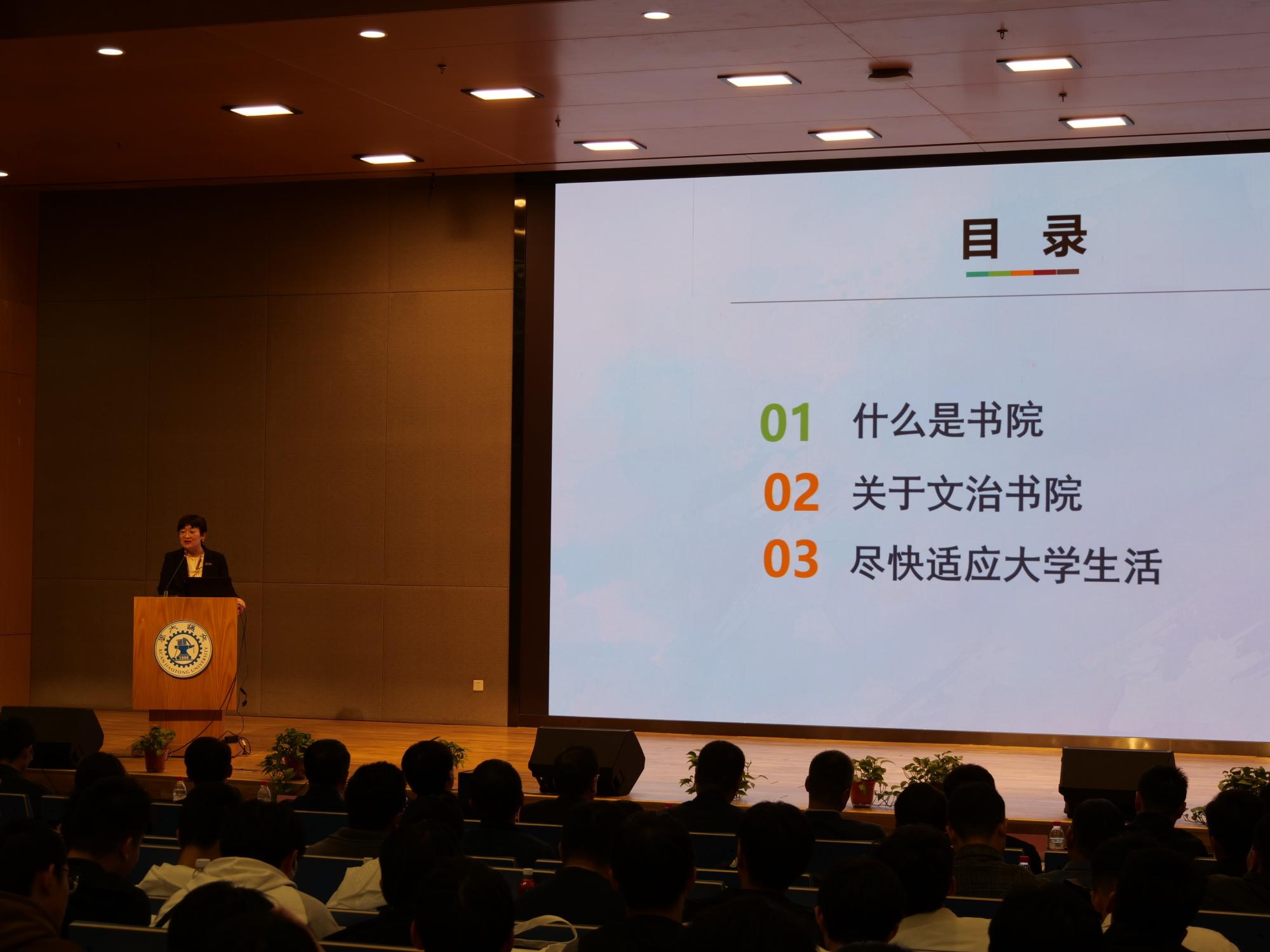 文治书院院务主任王琦介绍了书院发展历程,从书院的理念、特点、组织架构、模式等方面介绍了书院发挥的功能和作用,接着,她从文治书院的院训、育人使命、核心价值观、学风等方面展示了文治书院的育人体系。最后,她希望各位同学要做到心态调整、方法调整、养成主动精神,早日适应大学生活。