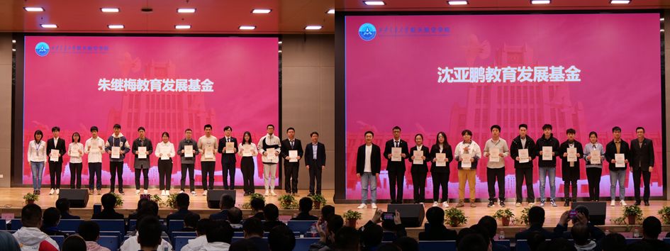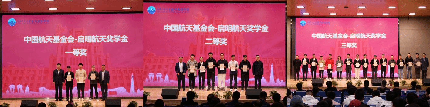 接着参会领导和嘉宾为“中国航天基金会-启明航天奖学金、垣矽技术教育发展基金、朱继梅教育发展基金、沈亚鹏教育发展基金的获得者颁奖并合影留念。