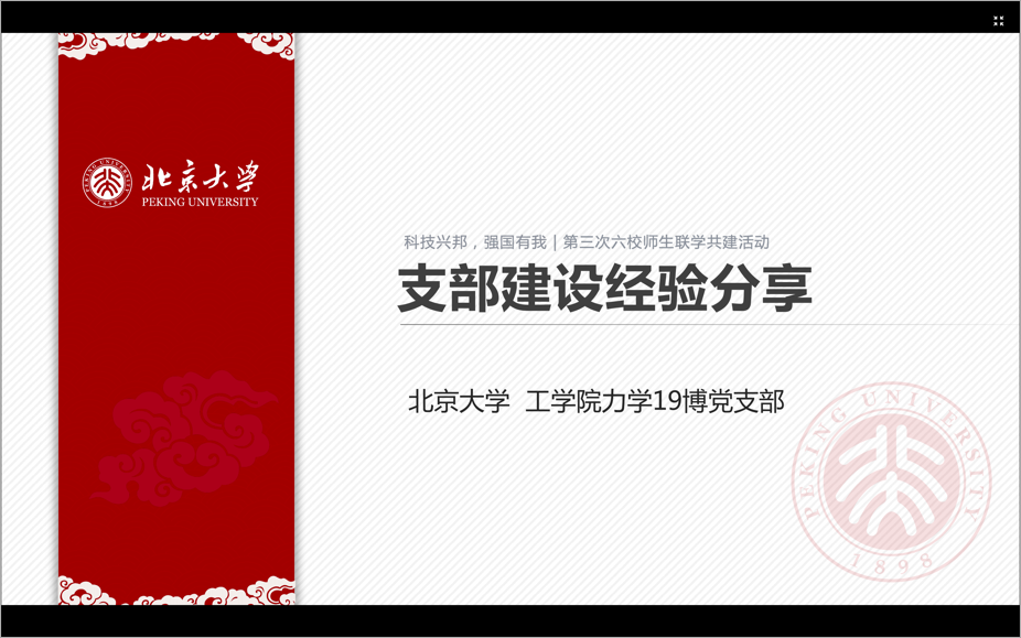 北京大学工学院力学19博党支部书记武文斌分享支部建设经验。武文斌首从“党员教育”“回顾十年变革”“科普实践”等方面介绍了支部基本情况
