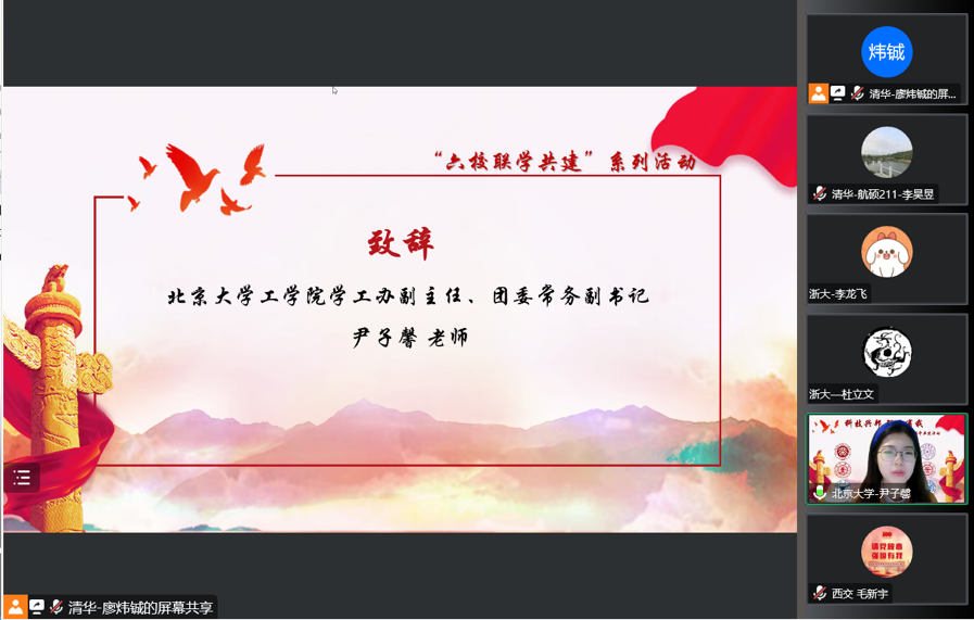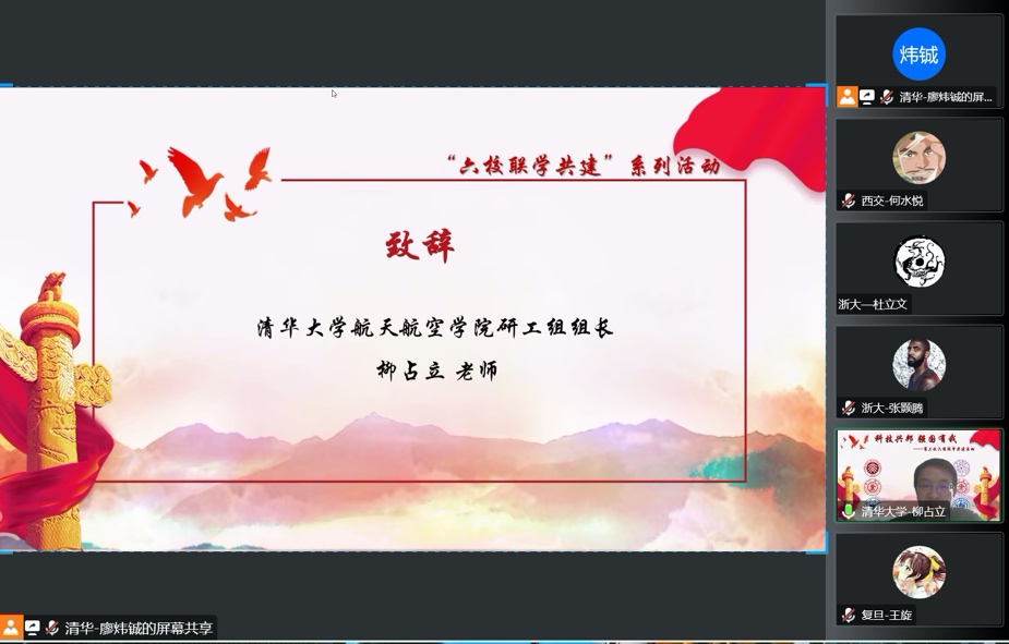 研工组组长柳占立,复旦大学材料科学系党建指导老师韩画宇,上海交通大学航空航天学院党建指导老师高瑾出席本次活动。来自六所高校的180余名学生党员通过线上方式参加活动。活动由清华大学色情网