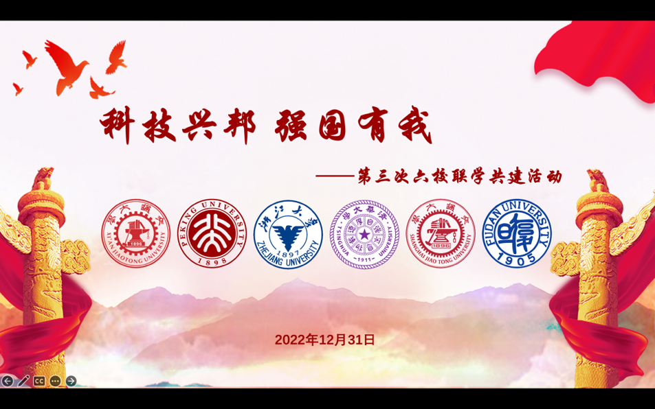 研工组组长柳占立致辞。他指出,六校党支部共建,能够加强党支部之间、高校之间、以及学科之间的相互交流,拓展了党支部建设的形式。本次活动主题是“科技兴邦,强国有我”,恰逢2022年最后一天,希望通过各支部对年度支部建设经验总结分享、交流学习,促进预祝本次活动成功举办。