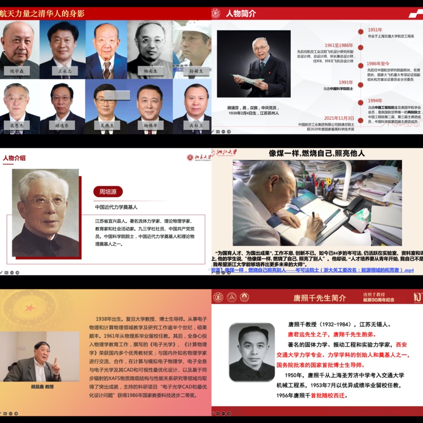 学生微宣讲团毛新宇围绕六校大师学者的精神事迹开展领学。他首先介绍了我国航天发展中的清华身影,包括以钱学森为代表、曾获“两弹一星”功勋奖章的14位清华校友。第二位是从“立志报国”“忘我钻研”“勤奋刻苦”三个方面介绍了2020年度国家最高科学技术奖获得者顾诵芬的精神事迹。第三位大师是中国科学院院士、中国近代力学的奠基人周培源,毛新宇分别从“胸怀祖国,勇攀高峰”“托举后背,为国育才”“胸怀天下,铁肩道义”“尽心国是,建家交友”四个方面介绍了周培源光辉的精神事迹。第四位介绍了“像煤一样,燃烧自己,照亮他人”的浙江大学能源工程学院岑可法院士。岑可法院士情系教育、甘为人梯、诲人不倦,功勋卓著又两袖清风,是每一位浙大人学习的榜样。第五位介绍了复旦大学教授顾昌鑫及其在激光大气通讯领域取得重大突破和巨大贡献。最后,第六位介绍了我国著名的固体力学、振动工程和实验力学家,色情网