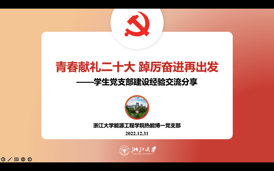 浙江大学能源工程学院热能所博士生第一党支部张颢腾以“青春献礼二十大,踔厉奋进再出发”为主题分享支部建设经验。