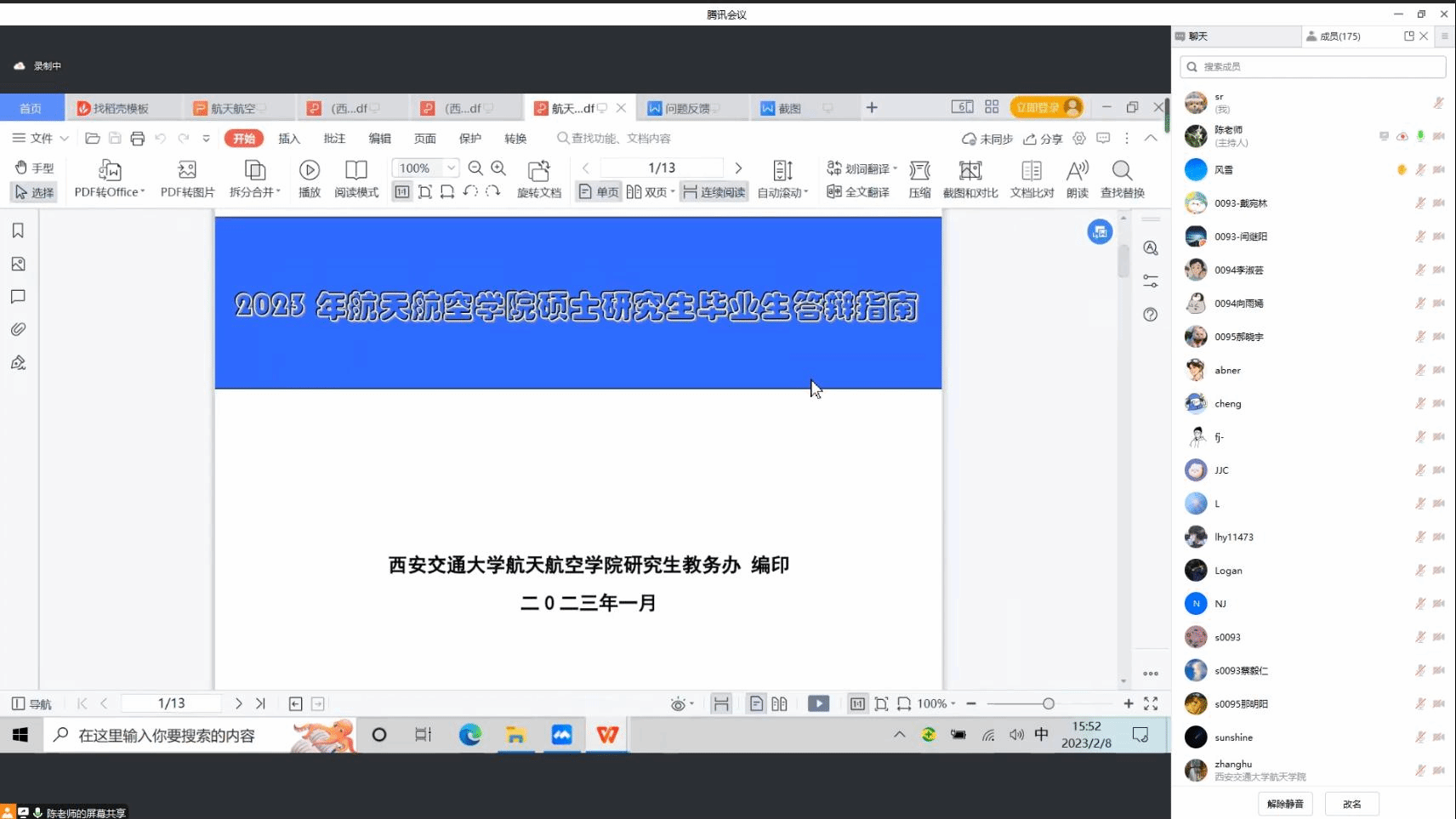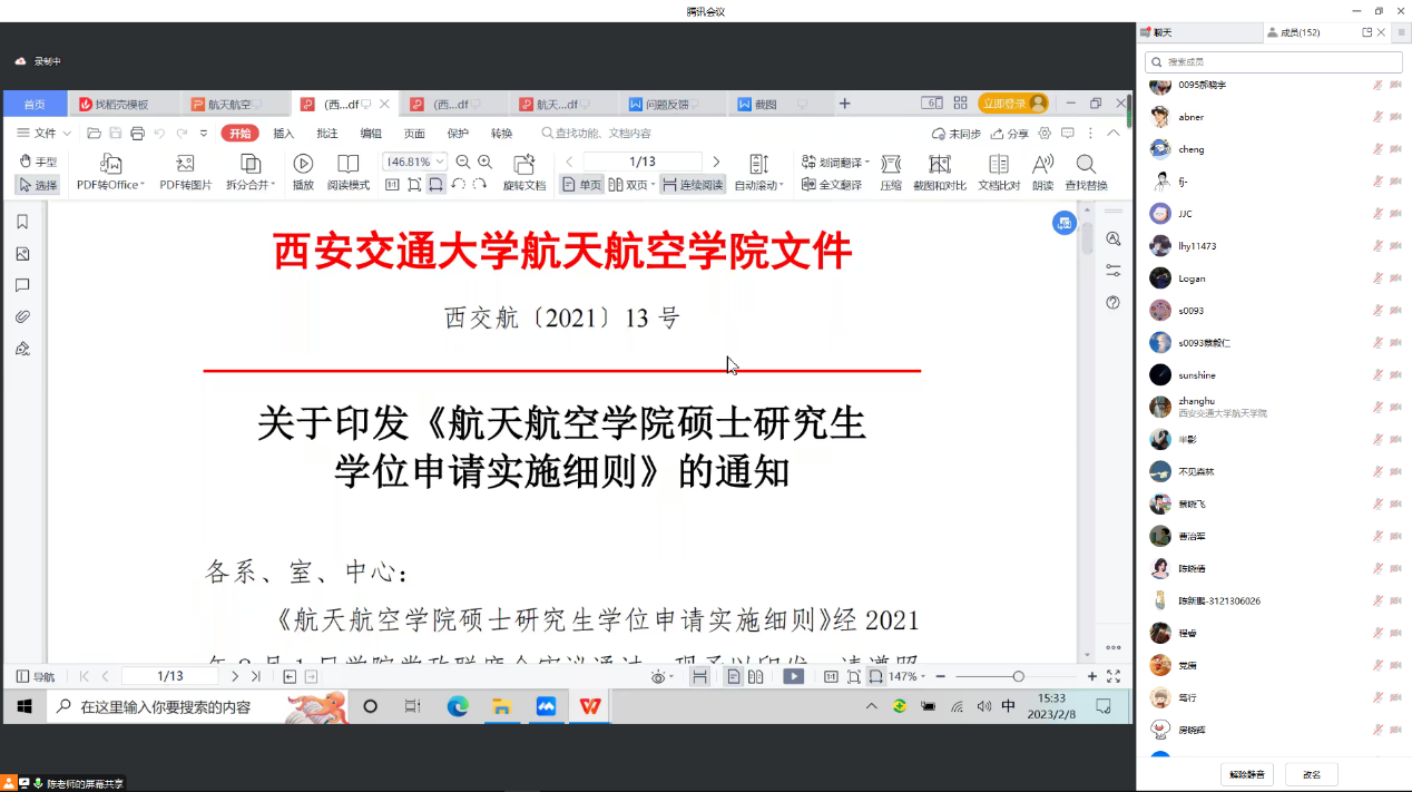 硕士学位论文抽检实施办法》,介绍了硕士论文的抽检原则和比例、抽检方式等,尤其强调了涉密论文在抽检方式上的变化,提醒同学们务必重视论文质量。最后,陈老师为大家展示了《2023年航空航天学院硕士研究生毕业生答辩指南》,详细说明了学位申请和毕业流程、重要时间节点和主要事项,同时也强调了在学位论文撰写过程中要规范学术行为,切勿触及红线。