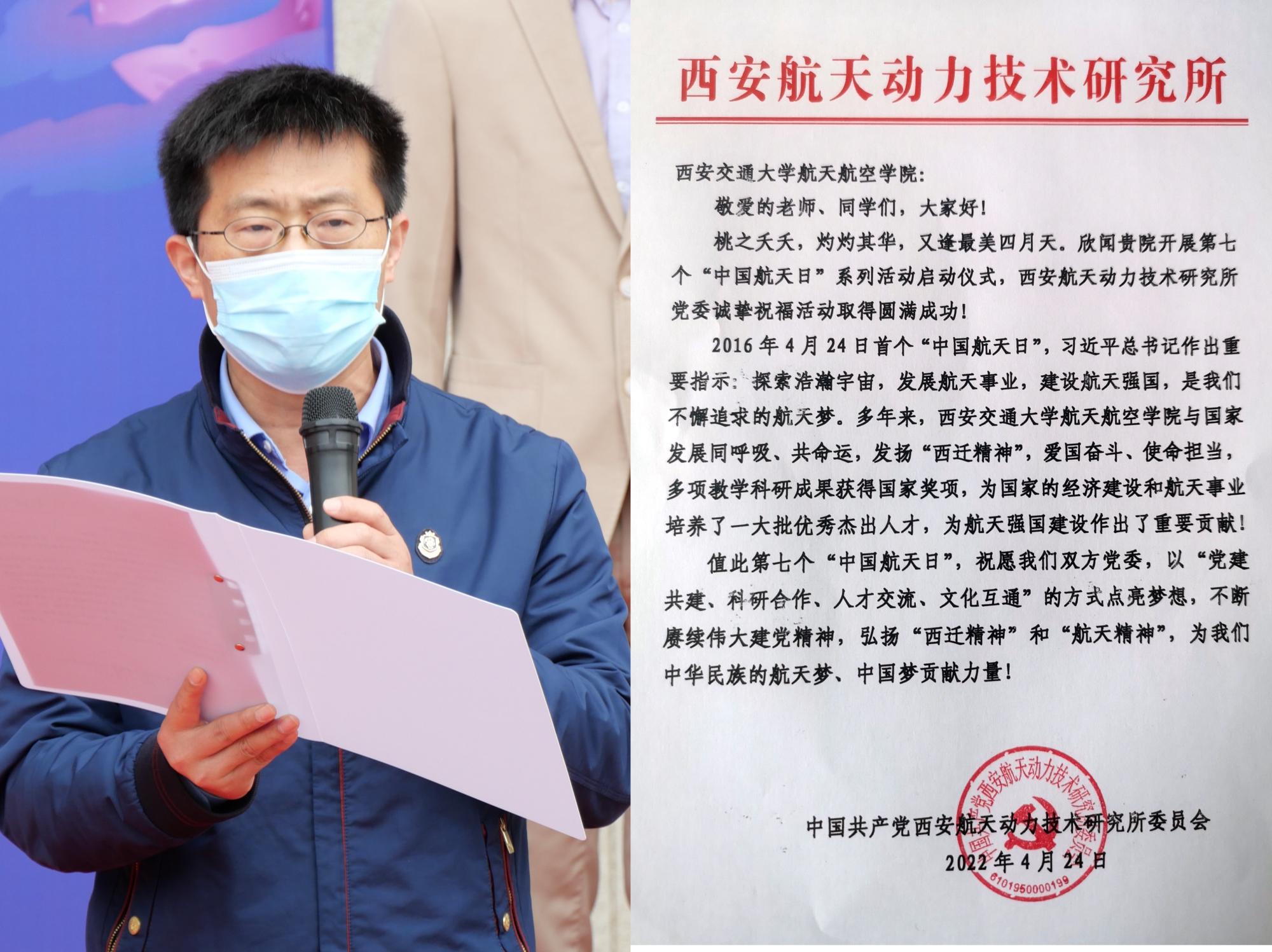 柴渭副校长在讲话中指出,2022年是实施“十四五规划”的关键之年,也是中国航天事业创建66周年。66年来,一代代航天人自强不息、接续奋斗,走出了一条中国特色的航天发展道路。“中国航天日”是唱响“发展航天事业、建设航天强国”主旋律的重要载体,是普及航天知识、激励科学探索、培植创新文化的重要平台,也是我们传承航天精神、弘扬西迁精神、凝聚强大力量的重要纽带。希望航天学院要牢牢抓住产教融合这一战略机遇,坚持创新驱动发展,勇攀科技高峰,为服务国家航天事业发展大局作出更大贡献,在未来发展中取得更好的成绩!