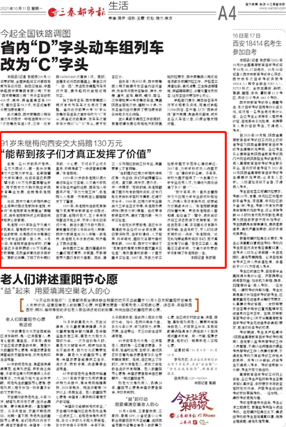 熟悉朱老师的人都知道,他俭省了一辈子,退休后依然将工资悉数存下支持教育。“我住在老年公寓,平日里也没有额外的开销,生活足够了,家人们也很支持我这一决定。”朱继梅说,“这笔钱如果能帮助到孩子们,那才真正发挥了价值。”