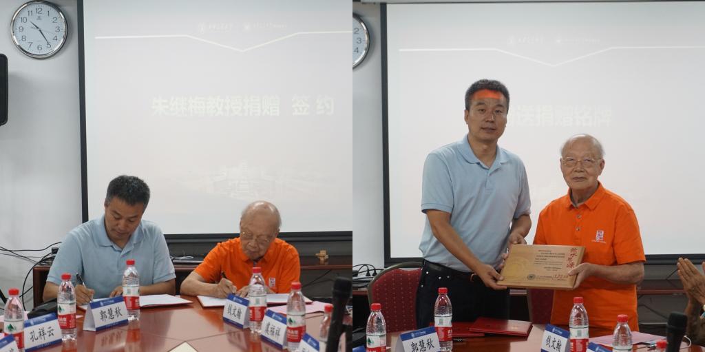 朱继梅教授(右)、赵卫滨(左)签署捐赠协议,赵卫滨为朱继梅颁发捐赠纪念铭牌