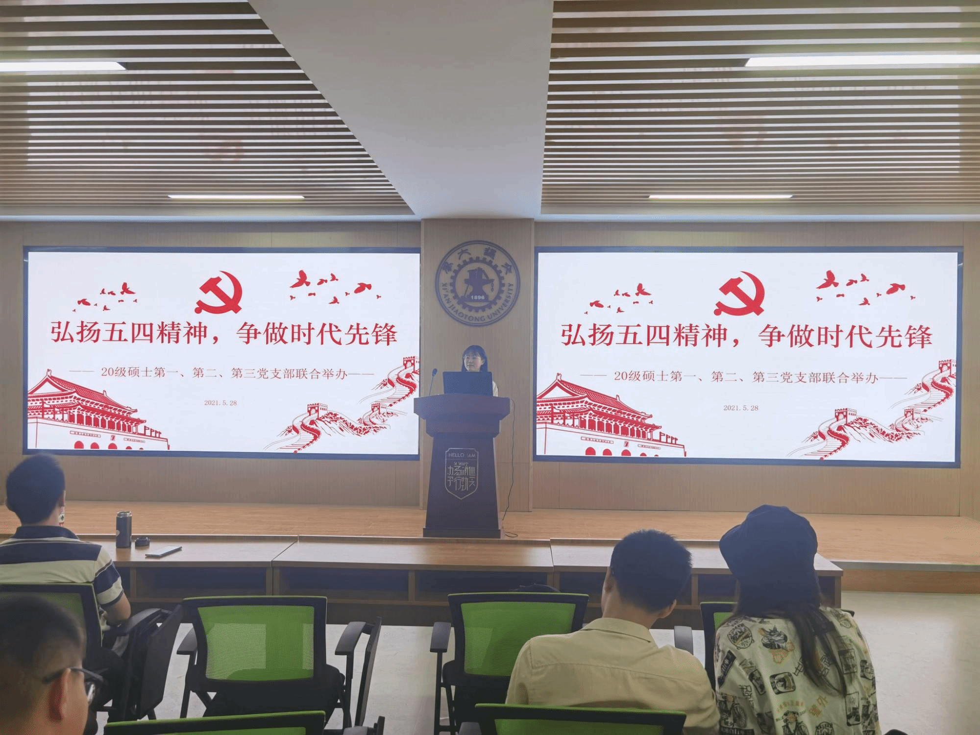 硕士20级第一、第二及第三党支部于力行楼2-4197会议室联合组织开展了“弘扬五四精神,争做时代先锋”主题党日活动。学院党委委员、副院长卢同庆,硕士20级第一、第二、第三党支部全体党员与积极分子参加活动,本次活动由20级硕士第二党支部王志国主持,。