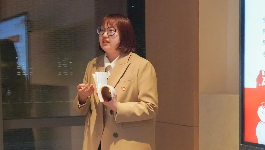 马克思主义学院2020级硕士生李楠向大家分享书目《革命者》。她向大家介绍了这本书的独特之处——用文学手法写新闻报告,深情并茂地向大家朗读了书中令她触动的地方,并将书本中塑造的英雄群像与去烈士陵园扫墓的经历相结合分享了自己的心得感悟。