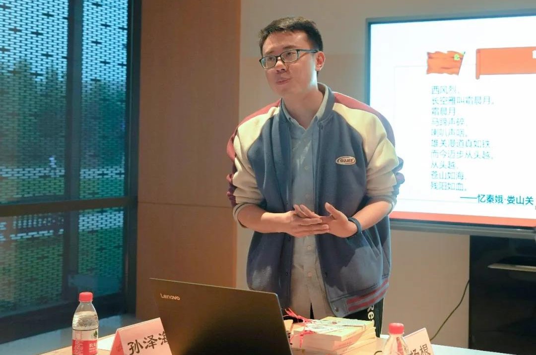 分享会上,马克思主义学院2019级博士生孙泽海向大家分享书目《大河向东:他们为什么追随毛泽东》。他以毛泽东的一首气势豪迈的诗词——《忆秦娥·娄山关》作为开场,从周恩来、朱德、贺龙、罗荣恒、叶剑英等人对毛泽东的不同评价中展示了毛泽东高瞻远瞩、决策英明、受人敬重的形象。